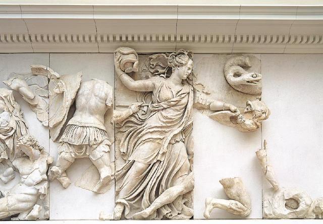 复原自土耳其的帕加马祭坛,表现巨人族与奥林坡斯众神的战争。图为祭坛北侧浮雕上的黑夜女神尼克斯,约公元前2世纪,德国柏林帕加马博物馆藏。 资料图片