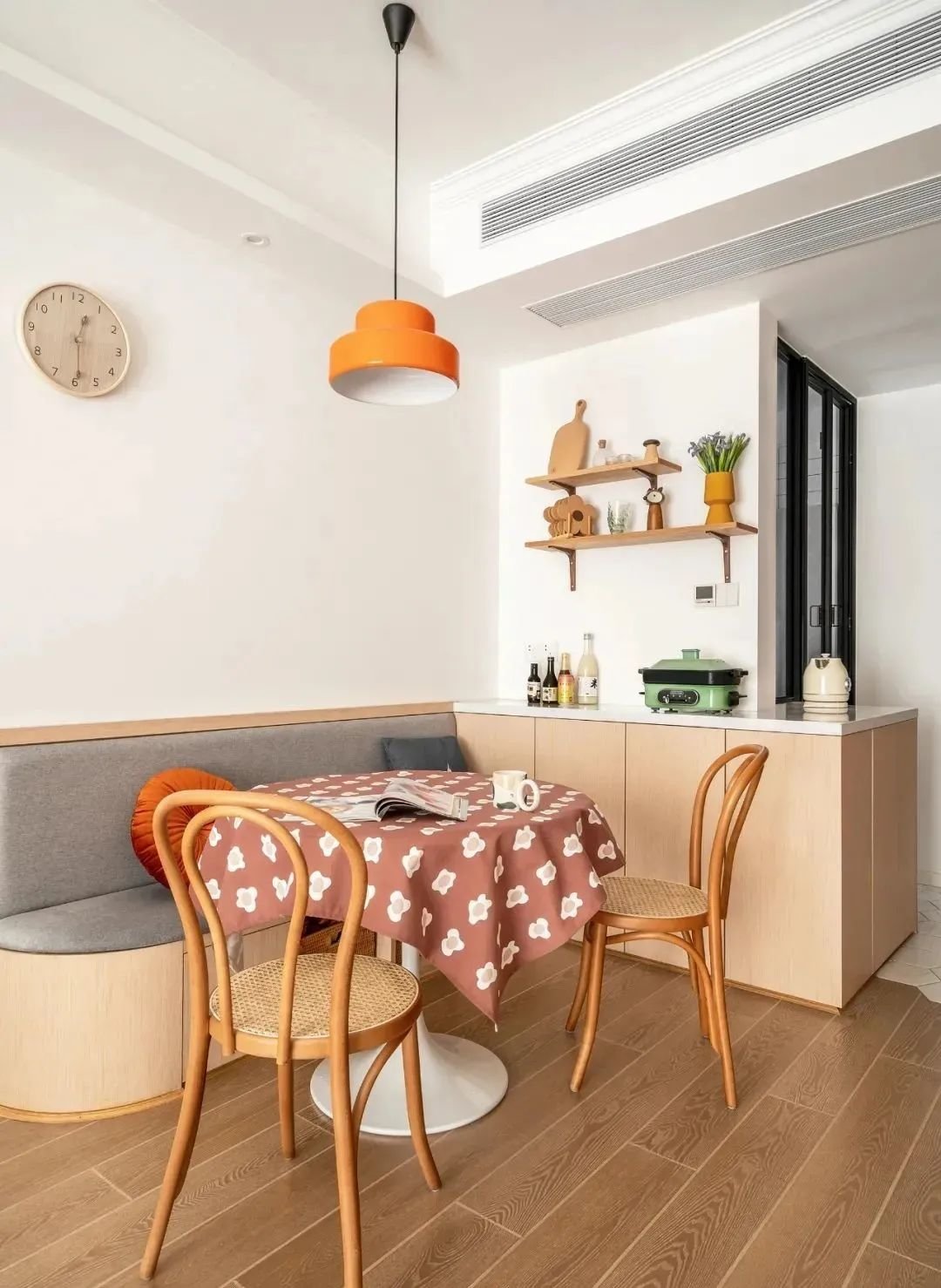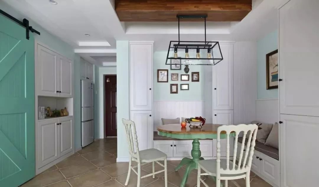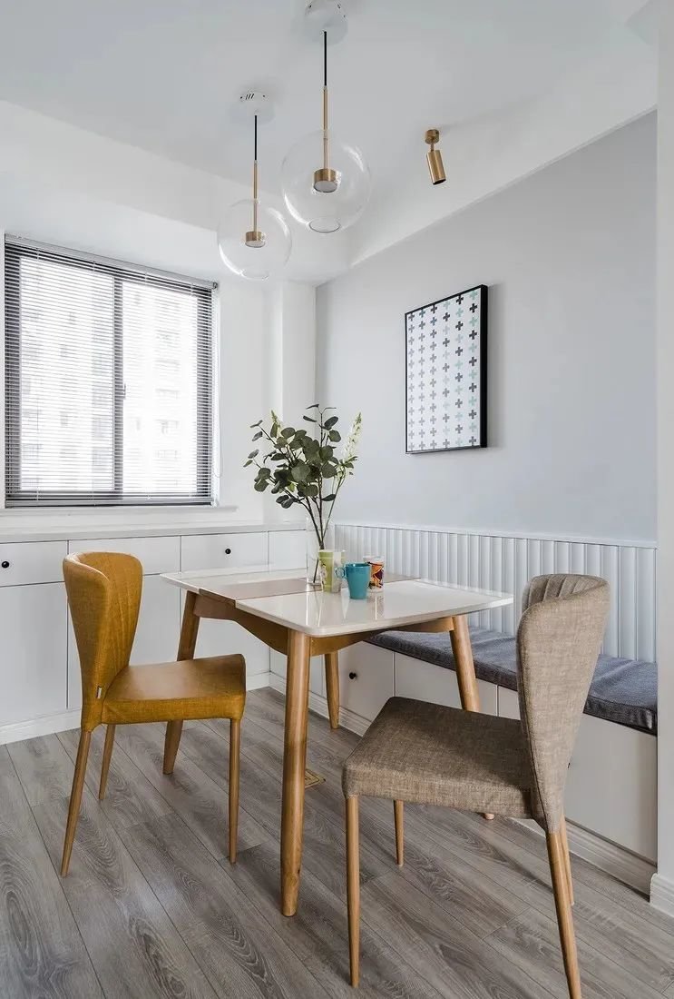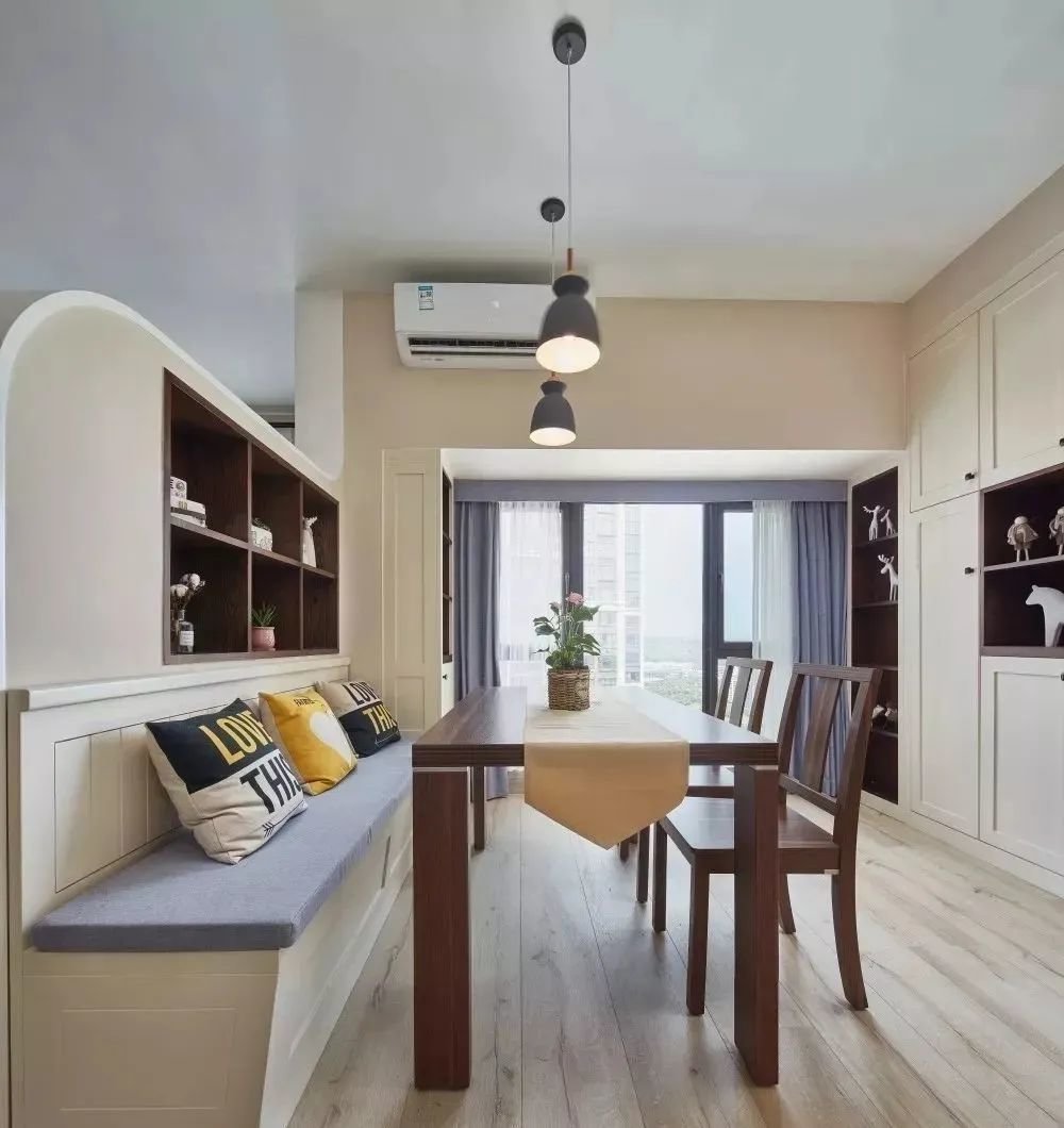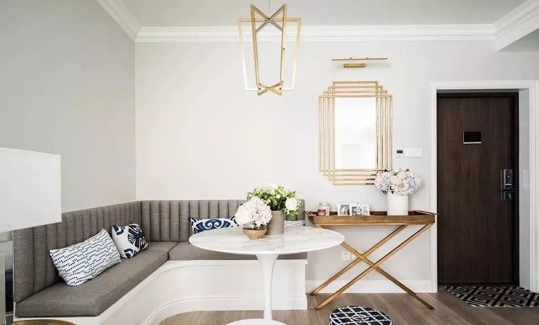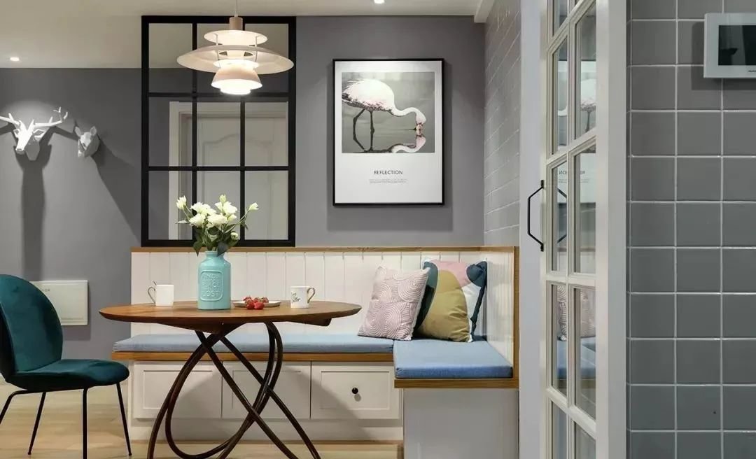 正常情况下,餐厅桌椅周围都需要留一部分空间,为了保证人们就餐时可以正常活动。如果靠墙设计一个卡座,靠墙的那部分活动空间则不需要预留,完美节省空间。