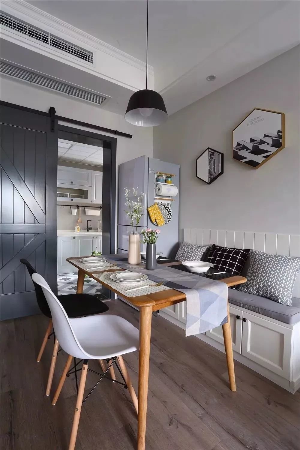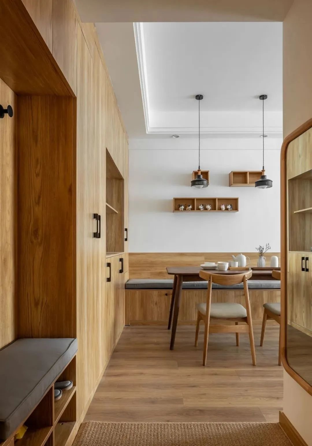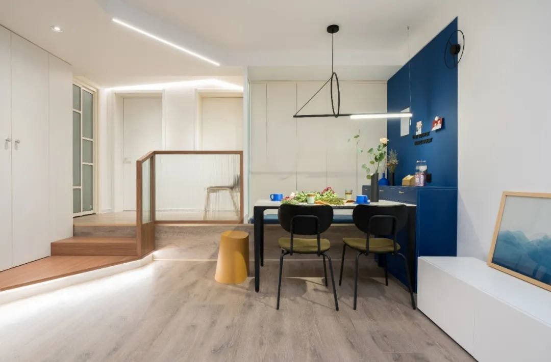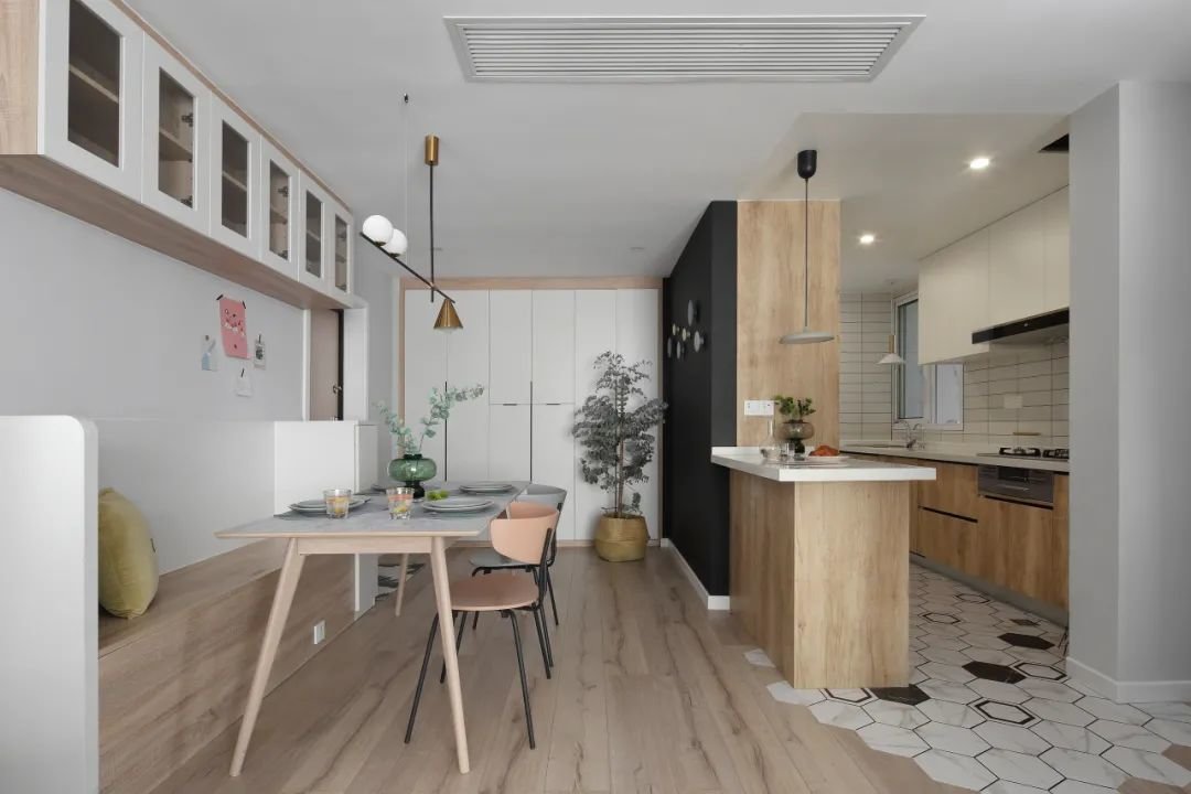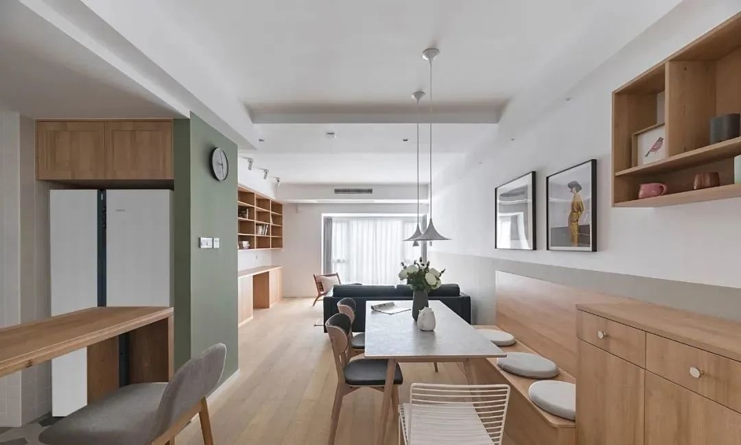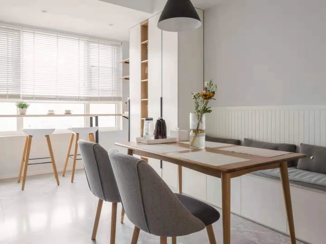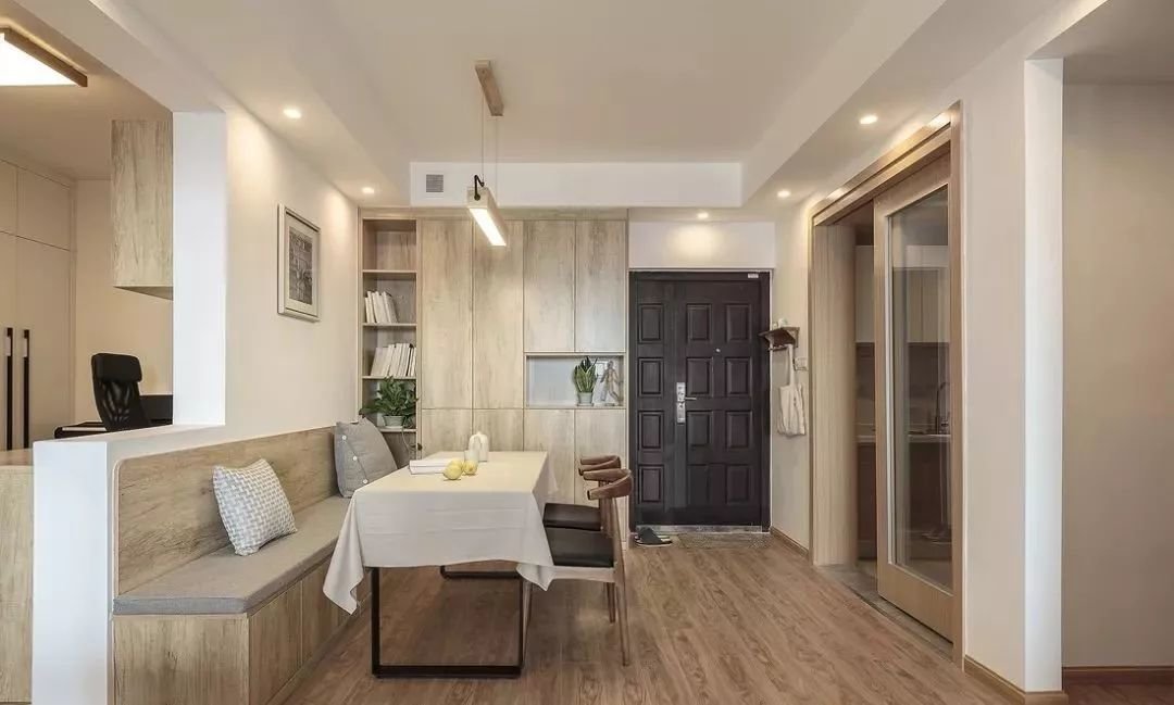 餐厅与过道共用位置,卡座靠墙,餐桌与餐边柜一致,更好地节省过道面积。