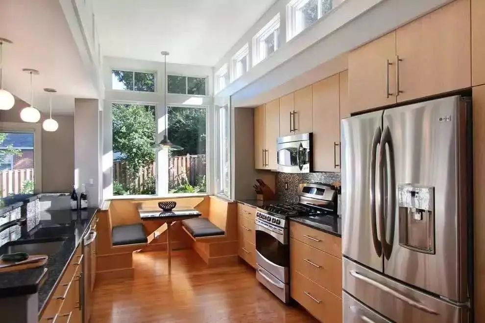 双面卡座设计的最佳位置是窗户,不仅能作为用餐地方,还能作为休闲区使用,一边阅读一边欣赏美景。