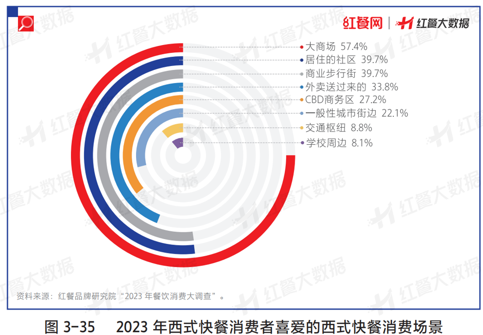 大商场店、社区店、商业步行街店、外卖都是西式快餐的主流消费渠道。“2023年餐饮消费大调查”数据显示,选择在大商场店就餐的西式快餐消费者占比最高,为57.4%;选择社区店和商业步行街门店的西式快餐消费者占比相当,均为39.7%;选择点外卖的西式快餐消费者则达到了33.8%。