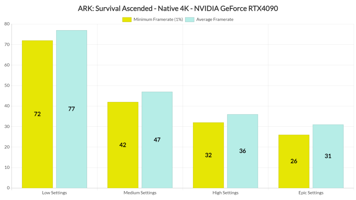 在Dsogaming的测试中,即便测试平台使用的是Ryzen 9 7950X3D、32GB DDR5(6000Mhz)内存、NVIDIA RTX 4090,在原生4K的分辨率下它的平均帧率也只能在低画质下超过60帧,详细测试结果如下: