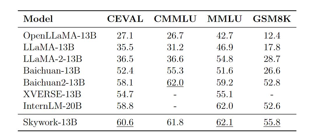 本次开源的Skywork-13B系列模型在CEVAL, CMMLU, MMLU, GSM8K等几大权威评估基准中全面超越LLaMA2-13B等开源大模型,在同等规模大模型间取得最佳效果。(截止至10月25日数据)