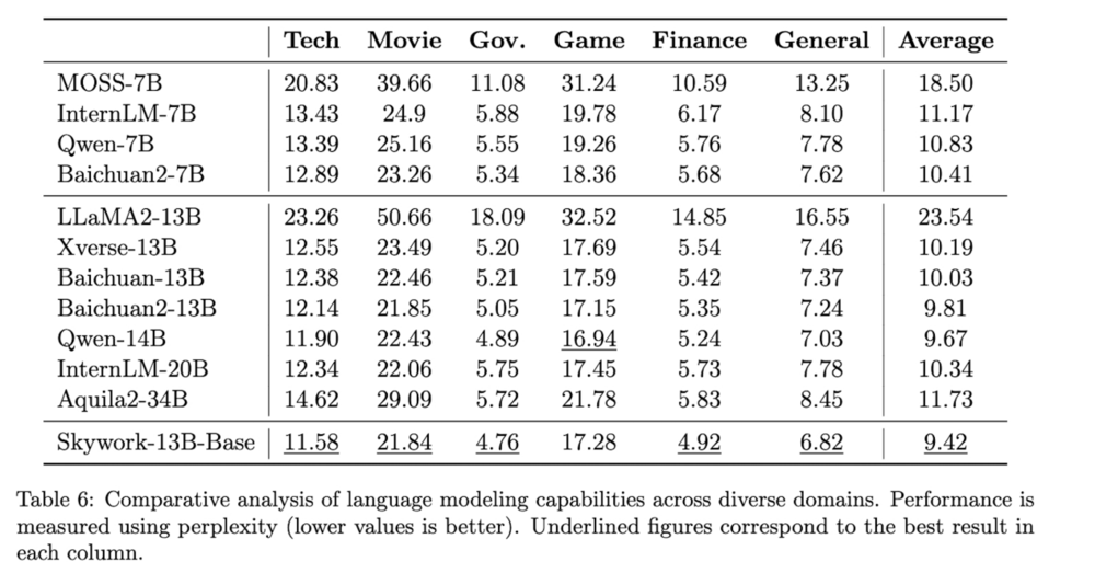上图为不同领域数据下评估模型的困惑度,越低代表模型在该领域建模能力越强。结果显示天工13B在技术文章,电影,政务报告,游戏,金融,通用领域均表现出色