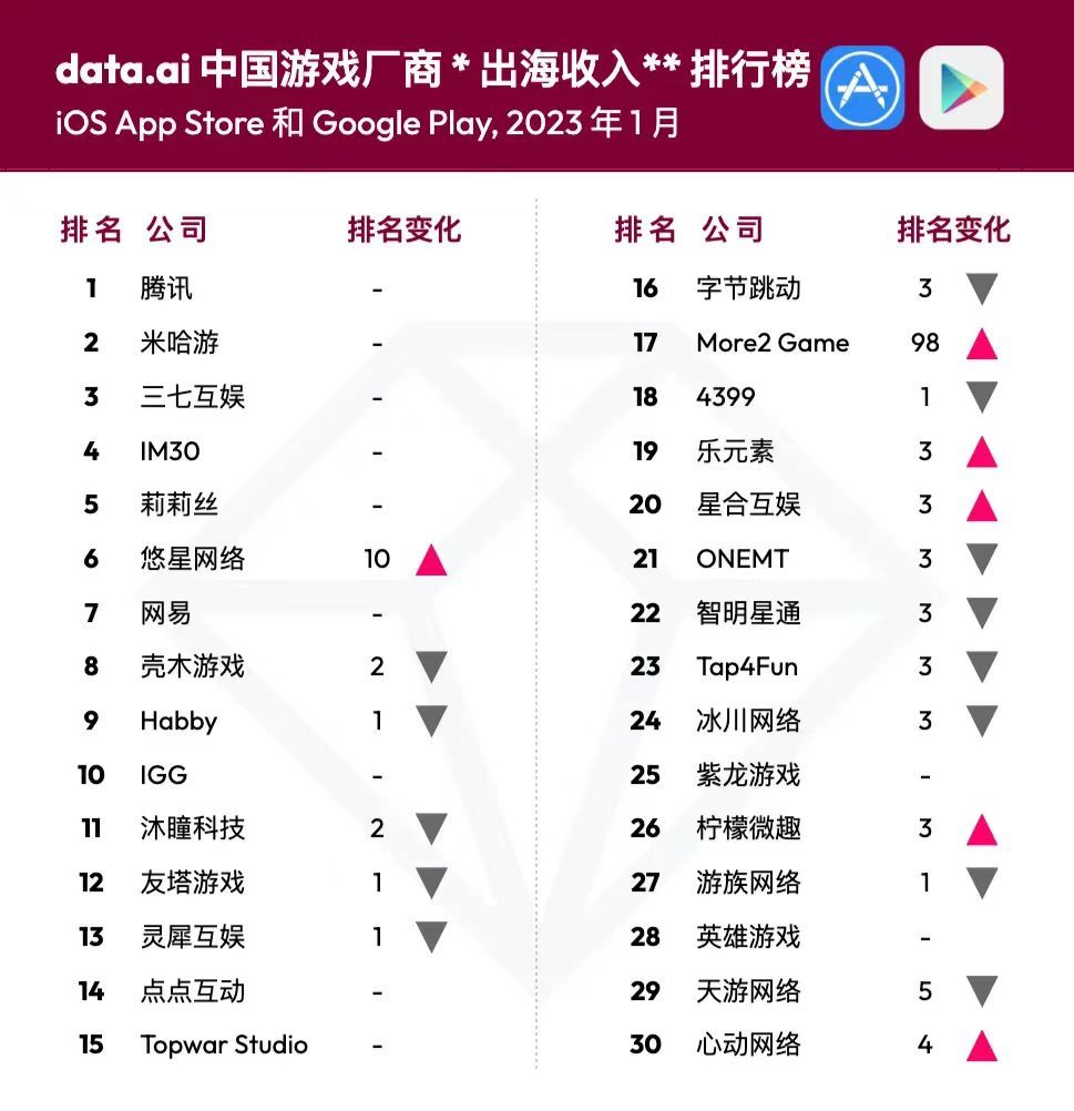 据dataai CN发布的2023年1 月中国游戏厂商及应用出海收入30强榜单,凭借《马赛克英雄》1月份的出色表现,More2 Game当月排名上升98位至榜单第17位。