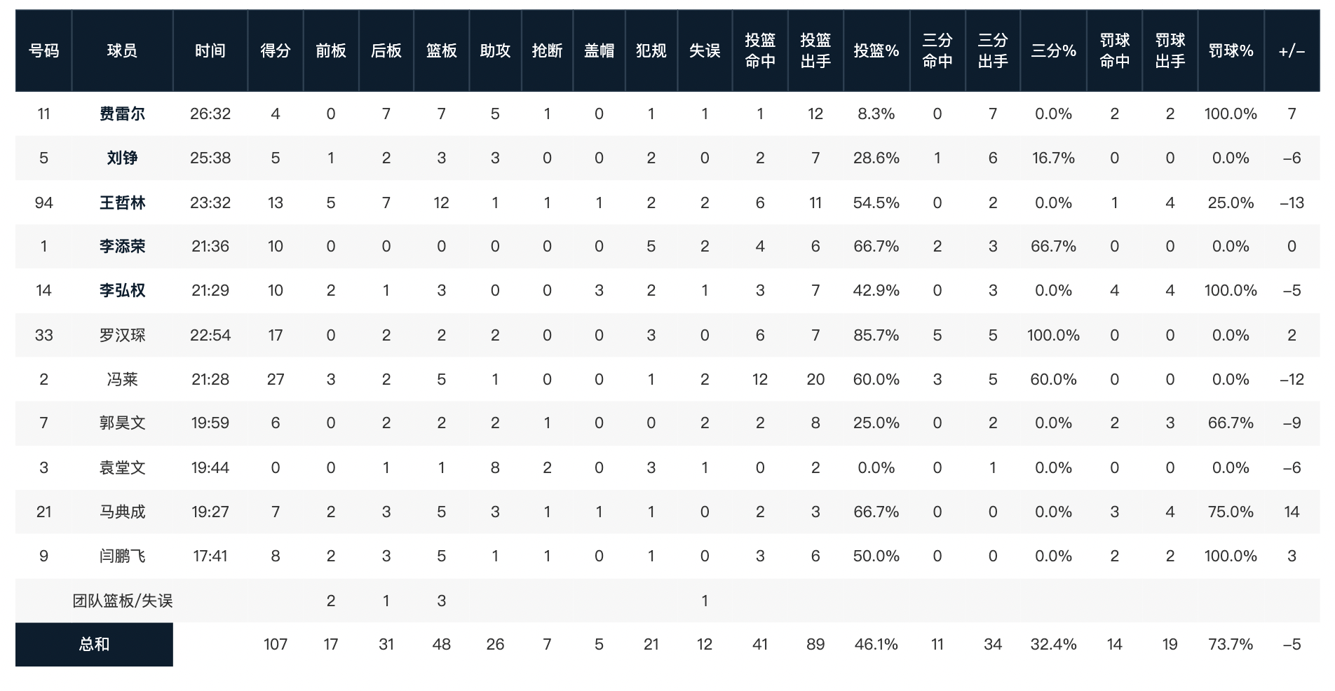 迎来赛季首秀的冯莱倒是表现不俗,拿下27分5个篮板,却依旧难以带领球队收获胜利。罗汉琛稳定输出17分,王哲林拿下13分、12个篮板的两双,李弘权和李添荣各有10分进账。
