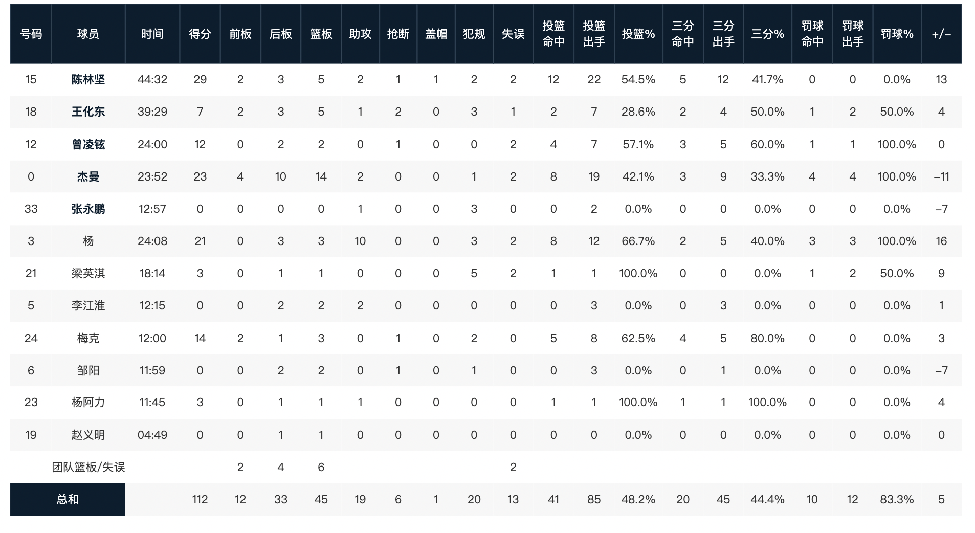 全场比赛,福建男篮在三分线外共出手45次,投中20球,命中率44.4%。其中,陈林坚一人就命中五记三分球,拿下全场最高的29分。