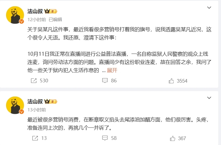鞭牛士 10月31日消息,近日,法律博主法山叔在微博上发文澄清自己在直播中透露某吴姓入狱明星现状。他在微博中称,10月11日直播间正常进行公益普法直播时,一名自称监狱人民警察的观众上线连麦,询问劳动法方面的问题。