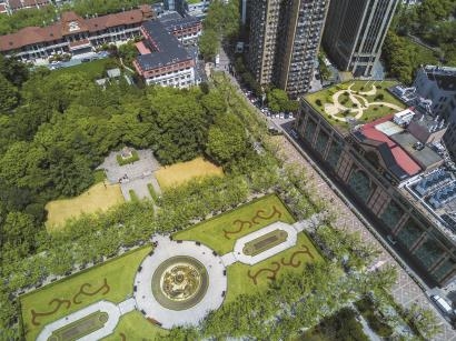 俯瞰复兴公园东北角,法式花坛与马恩雕像呈轴线布局(视觉中国)