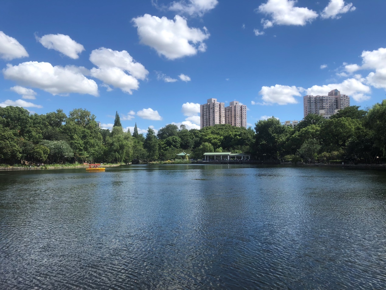 鲁迅公园“甜爱湖”北望“北大山”(中间两幢高楼下方),阔大的湖面与亭榭建筑