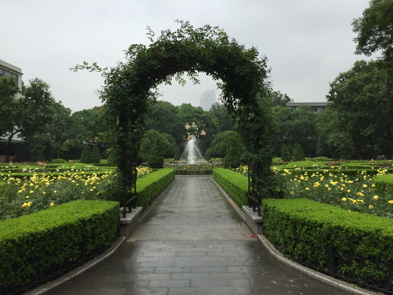 中式园林与北部月季花坛之间是散植的大悬铃木,现为茶室和儿童乐园功能区域,一定程度缓解了南北风格的冲突感。复兴公园的法国梧桐(悬铃木)也是一大特色,成行成列、绿荫如盖,也是法式园林的特征。