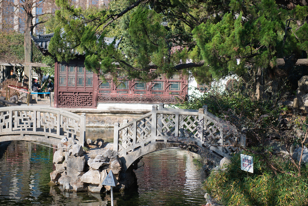 与法式风格鲜明对比的,是复兴公园西南片的中国古典园林区域。这是中国设计师郁锡麒1920年代的作品,以西南角为主山,山丘不高,向北向东沿墙界伸展,形成余脉。主峰上有一亭,下造悬崖洞窟,有瀑布下小潭,曲折连通东面大池(现铺设路面截断)。水脉由大池向南过石桥收口,变为涓涓溪流,消逝在南门附近。池南有类似鲁迅公园的亭、台、榭组合建筑,新中国后仿古典园林样式建造。池的驳岸设计手法巧妙,在今南门石桥附近,用大量湖石堆砌了一个半岛式的驳岸,曲折蜿蜒,如同山脚,与主山遥相呼应,恰有侧身生长的老树一株,十分自然。