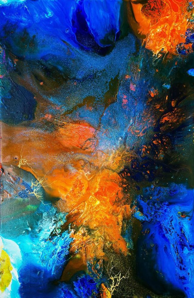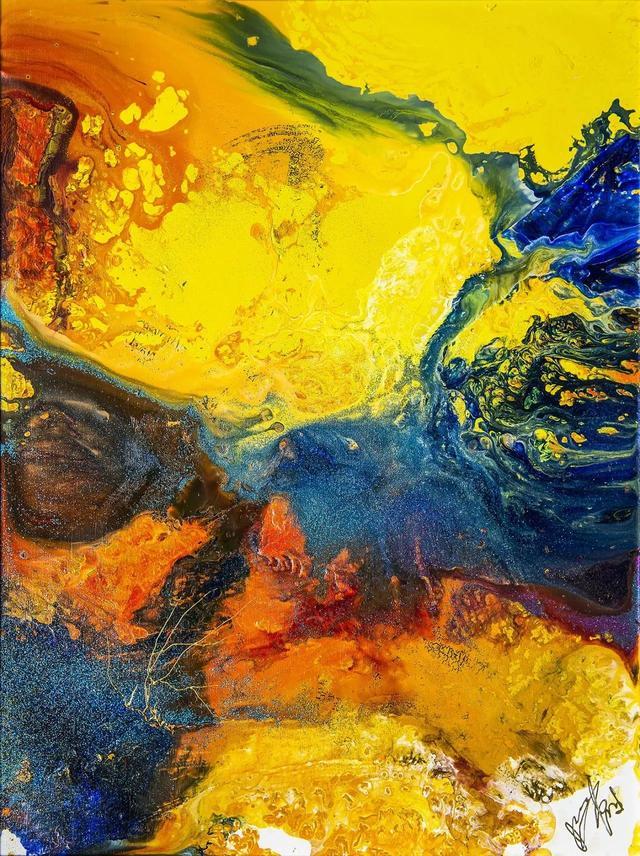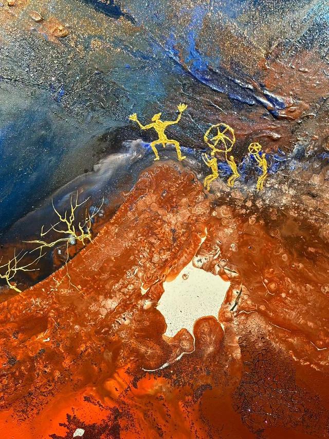 无论微观如草芥,还是宏观如山川湖海甚至宇宙的星辰大海,在曹俊笔下都能量满满。而肌理上层层叠叠的堆积并非为了炫技,而是作为一名采矿工程专业的毕业生对矿石这一材质的熟稔和敏感。曹俊也在漫长的旅居海外的时光里,学习并感受不同文明的精彩,去遥想人类文明曙光时代先人的生活与环境,如远古洞穴壁画、中南美洲的太阳神崇拜,那些先人朴素的信仰都深深打动过他,这些情绪也都付诸于笔端流淌。有时候,灵感来自一阵风;有时候,则是山川湖海的自然回响,或是草木葱笼的气味……这或许就是万物有灵予我们的启示。所以,乃有“巧夺天工”之词藻,那意思便是说,人类文艺之事,或许只是模仿苍天众神;而后乃有“笼天地于形内,挫万物于笔端”——阮籍与嵇康的高山流水,敦煌飞天乐舞的婀娜旖旎。而它们,在后来时光无痕的流逝中始终有着嘹亮的回荡,也启引着一代又一代人找寻精神归宿。