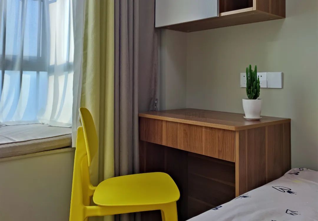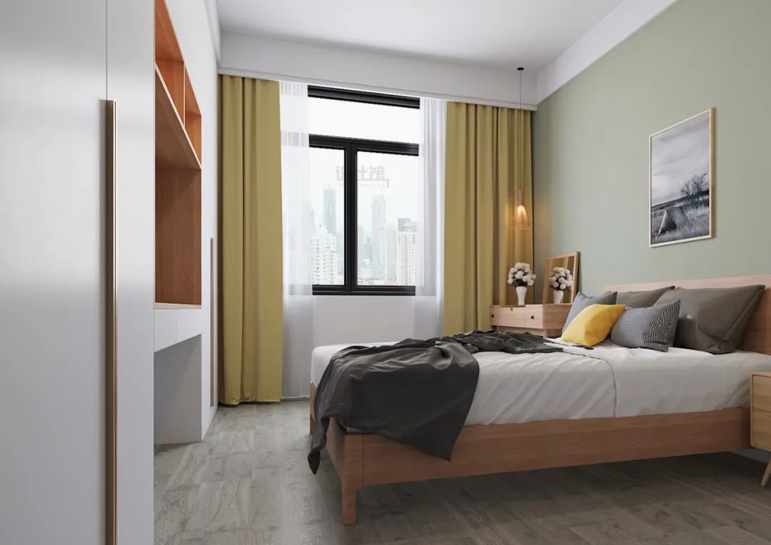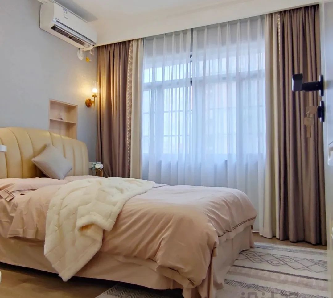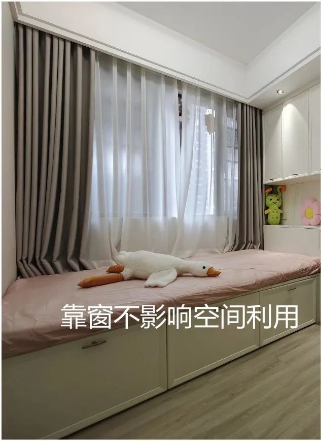 一般卧室面积比较小的话,为了实现空间利用,窗户旁边与两侧可能要布置家具,这种情况的窗帘安装就要避免与家具冲突了。