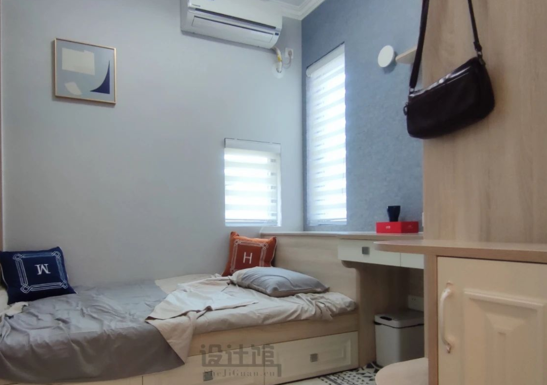 在小户型的小卧室里面,窗帘的安装有着更多因素——首先是因为小卧室里摆上床、衣柜与床头柜等家具后,往往窗边是要摆放家具的;其次是小窗户的尺寸小,安装窗帘有更多的方式可选。