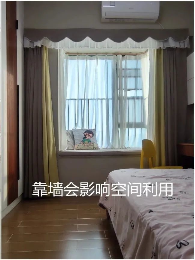 ②窗帘靠墙安装:遮光效果好,但窗户旁边与两侧都不能布置家具,否则与窗帘会有冲突。