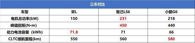 为了评判宋L的三电系统,我们汇总了三款产品入门款车型的参数信息。从中可以看出虽然三款车型都是单电机版本,不过宋L的电机最大功率表现差强人意,连带着其零百加速也比智己LS6和小鹏G6慢了2s以上。不过在电池容量上宋L却是最高的,搭载了71.8kWh的CTB电池组,但是其CLTC续航里程却是三款车中最低的,这一点很令人疑惑。电机功率最低,电池容量最高,这也反映出比亚迪宋L的电耗较高。