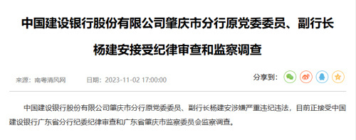 11月2日,据广东纪委监委官网“南粤清风”通报,建设银行肇庆市分行原党委委员、副行长杨建安涉嫌严重违纪违法,接受纪律审查和监察调查。