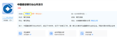 另外,天眼查信息显示,杨建安还曾在建行台山市支行担任负责人,目前该支行已注销。