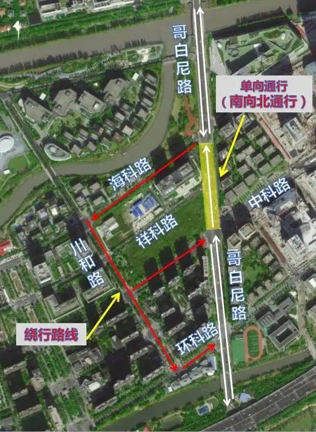 市公安局交警总队介绍,施工期间,哥白尼路(中科路-海科路)采取禁止机动车北向南通行的管理措施。原北向南机动车可沿海科路-川和路-中科路-环科路等周边路网绕行,绕行距离约900米。海科路(川和路-哥白尼路)拓宽为双向四车道(东向西3车道,西向东1车道),川和路(海科路-中科路)拓宽为双向三车道(北向南2车道,南向北1车道),祥科路哥白尼路口封闭(仅允许行人通行)。