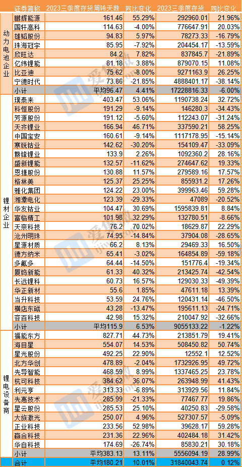2023年前三季度锂电产业链企业库存情况(单位:天、万元,来源:Wind)