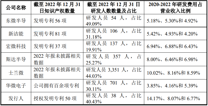 集微咨询专利分析师将尚阳通与招股书中选取的可比公司进行了专利实力比较,发现尚阳通的发明专利数量在这些可比公司中整体处于中等位置。从研发人员的数量来看,尚阳通相比竞争对手而言,研发团队的规模较小;而从另一方面来看,尚阳通研发团队平均每人的专利产出则显著领先于其他竞争对手,呈现出小而精的特点。