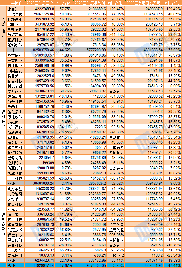 本次统计的锂材企业合计25家,前三季度合计营收3048.1亿元,同比下降2.41%,合计归母净利润同比下降52.62%至285.7亿元,可见今年锂材价格下滑对锂材产业链企业影响之大。