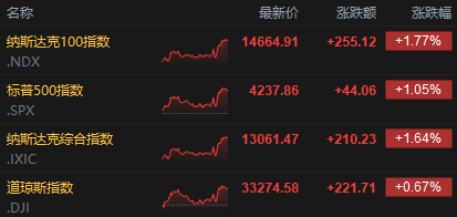 美股三大指数集体收涨。标普500指数收涨44.06点,涨幅1.05%,报4237.86点;道指收涨221.71点,涨幅0.67%,报33274.58点;纳指收涨210.23点,涨幅1.64%,报13061.47点;纳指100涨1.8%。