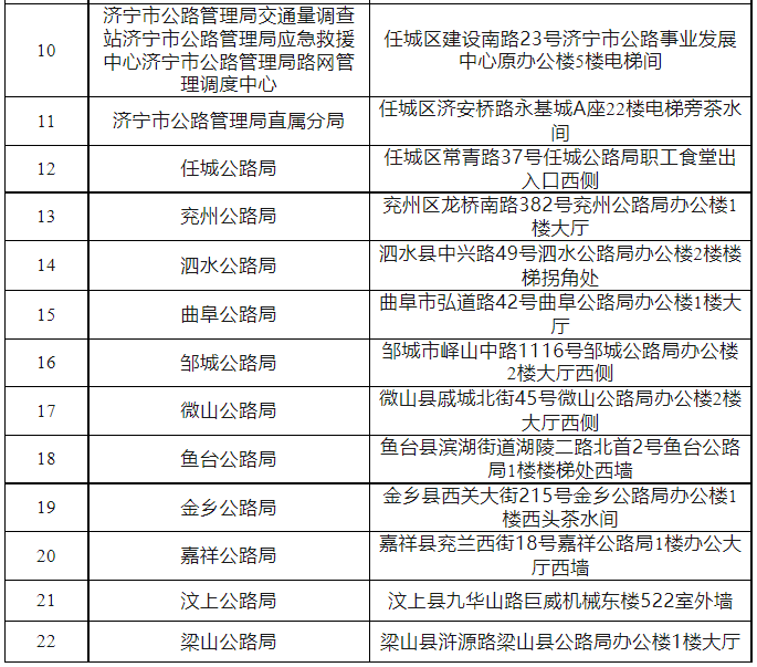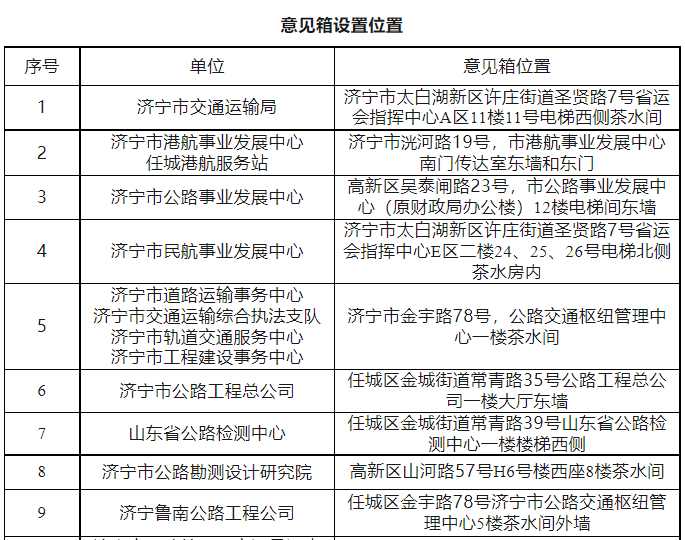 意见箱设置位置:济宁市太白湖新区许庄街道圣贤路7号省运会指挥中心A区11楼11号电梯西侧茶水间等22处(详情附后)