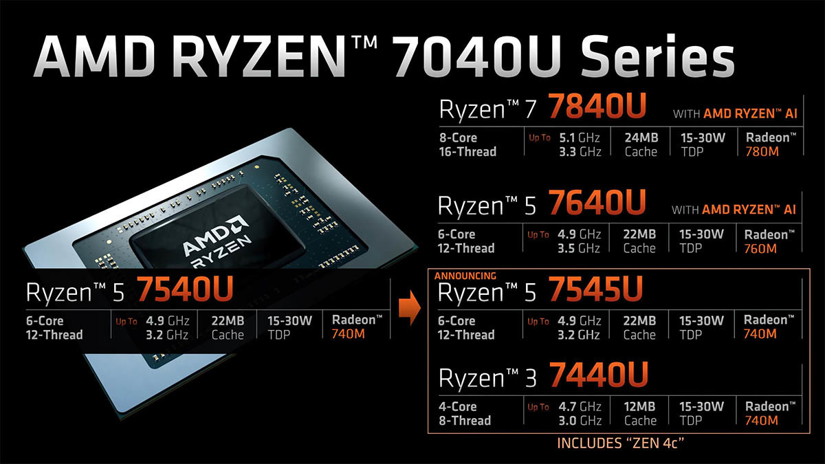 AMD采用Zen 4 + Zen 4c混合架构的Phoenix 2芯片其实早就用在面相掌机市场的Ryzen Z1处理器上,而AMD并没有让该芯片止步于此,现在他们把这款芯片正式推向移动市场,新推出Ryzen 5 7545U和Ryzen 3 7440U处理器就是拥有Zen 4c内核的混合架构处理器。