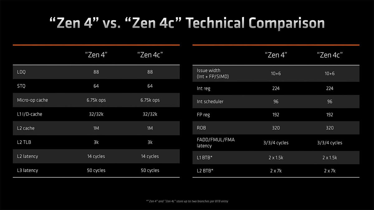 两者均基于台积电5nm工艺,Zen 4的单个核心尺寸是3.84mm2,而Zen 4c只有2.48mm2,的核心面积降低了35.4%,明显紧凑很多,两者都拥有1MB的L2缓存,这意味着L2 SRAM单元占用着相同的面积,AMD通过让L2控制逻辑电路更紧凑来减少L2缓存的区域面积,而在不包含L2和相关电路的区域,核心面积缩小了44.1%之多,前端和执行区域面积几乎减半。但浮点单元缩小的程度没有那么大,这可能是出于散热的考虑,因为FPU通常来说是内核最热的部分,另外内核的SRAM单元布局也更加紧凑,核心面积减少了32.6%。