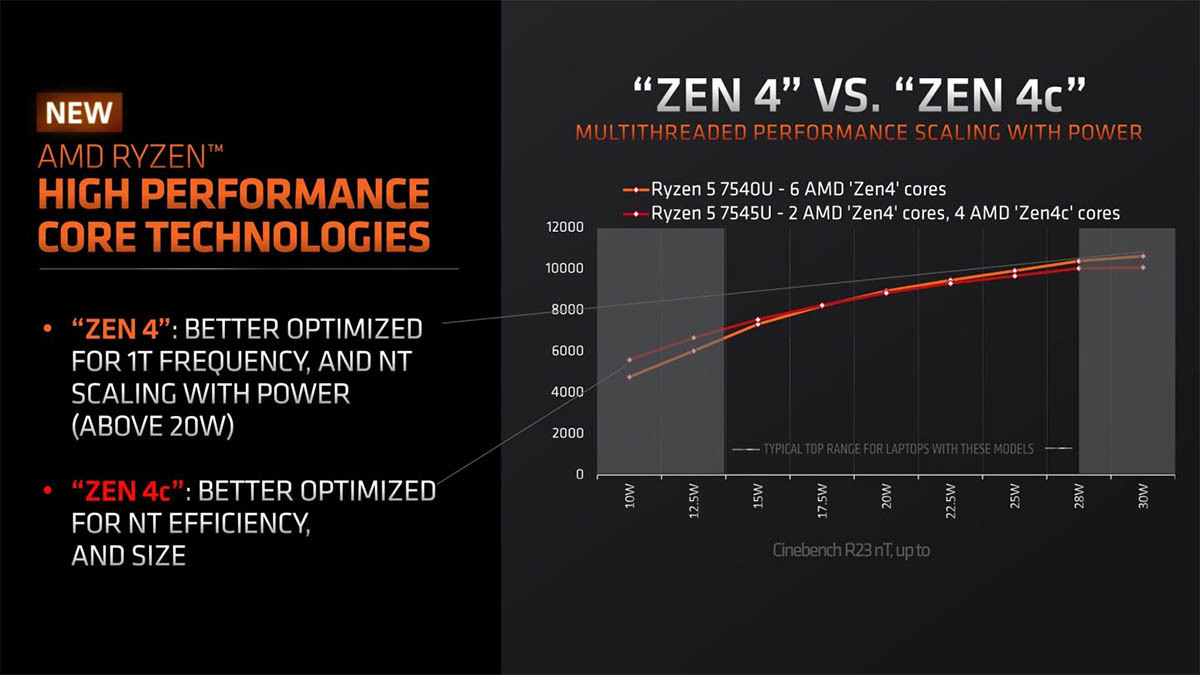 AMD对采用6个Zen 4内核的Ryzen 5 7540U和采用2个Zen 4加4个Zen 4c的Ryzen 5 7545U进行了不同功耗下的性能对比,在功耗低于15W之前Ryzen 5 7545U性能是要优于Ryzen 5 7540U的,两种内核的性能分歧点在20W左右,高于这功率Zen 4的性能就要优于Zen 4c了,不过说真的,和Intel的P-Core与E-Core的性能差距比起来,Zen 4和Zen 4c的性能差异真的很少。