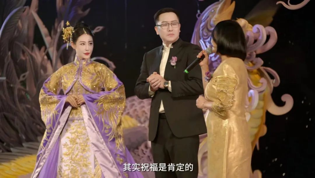 婚礼现场也极尽奢华、大咖云集,现场布景类似“海底龙宫”,左岸潇的紫色主纱,由高定设计师郭培设计,张兰、胡杏儿、黄奕、钟丽提夫妇、严宽夫妇等亲临捧场,黄晓明、夏雨、孙俪、高圆圆、张天爱等录了VCR送祝福。