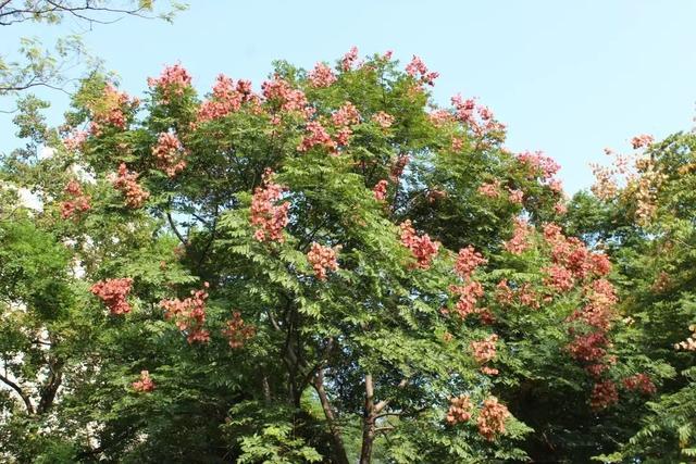 一串串果实生于树冠顶端,在阳光下摇曳着醉人的颜色。红色的荚果,绿色的树叶映衬着蓝色的天空,形成惊艳夺目的视觉冲击,真的该记录一下,方不辜负这美好的树种。