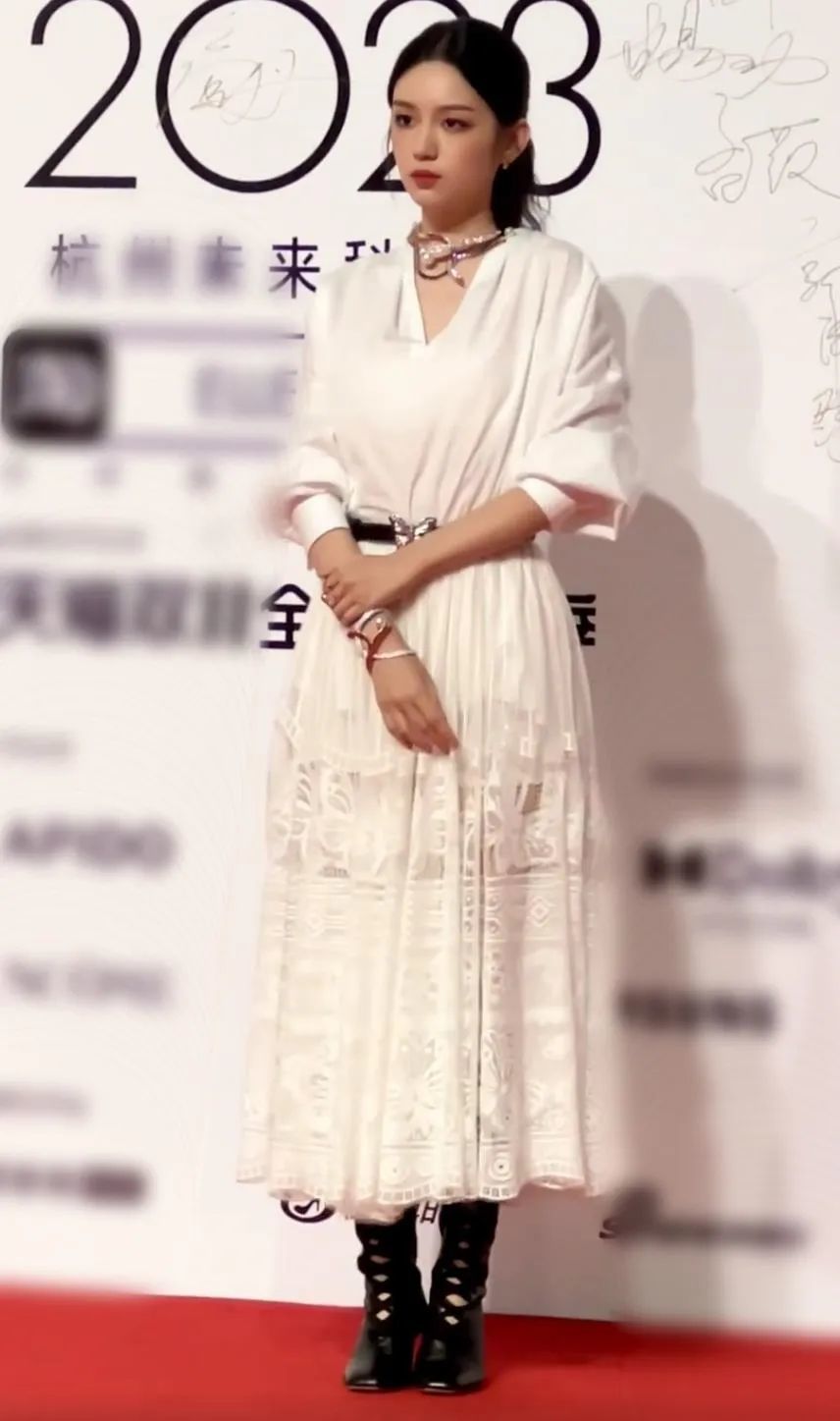 红毯常客钟楚曦这次也失手了,这条缀有三朵大红花的纱裙,真的很像造型师用从别人的中式婚礼上偷走的装饰带子做成的,配上红丝袜和红色高跟鞋,多了几分诡异。这身造型能夸的,也就只有大气的妆发和颜值了。