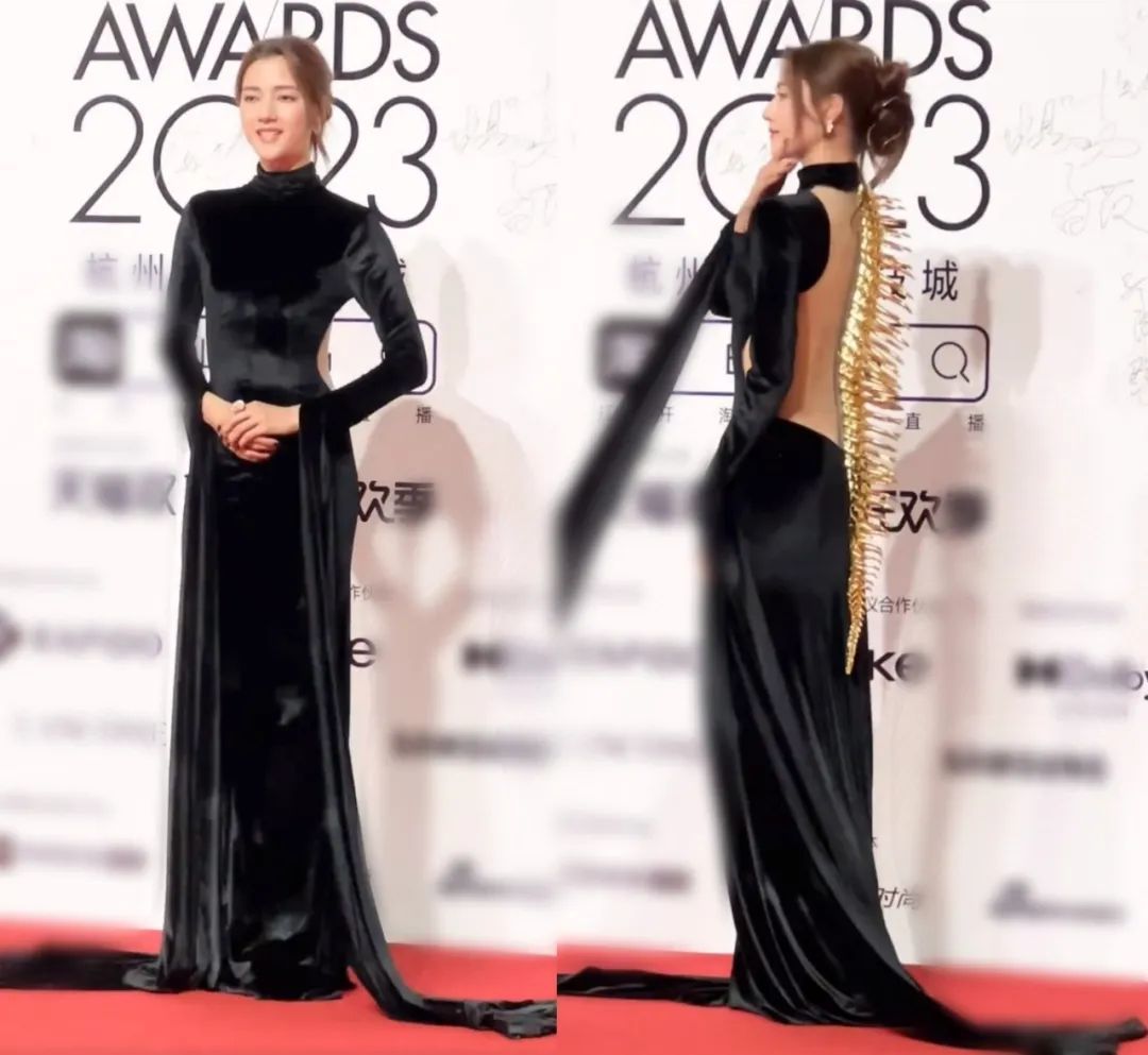 同样是全黑,娜然的丝绒长裙就很有看头,毕竟大露背的设计和金色鱼骨装饰会让裙子显得没那么单调。