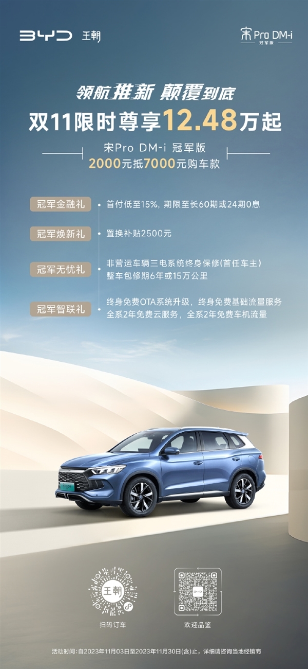 快科技11月4日消息,比亚迪紧凑型SUV宋Pro DM-i冠军版开启了双11大促:2000元低7000元购车款。