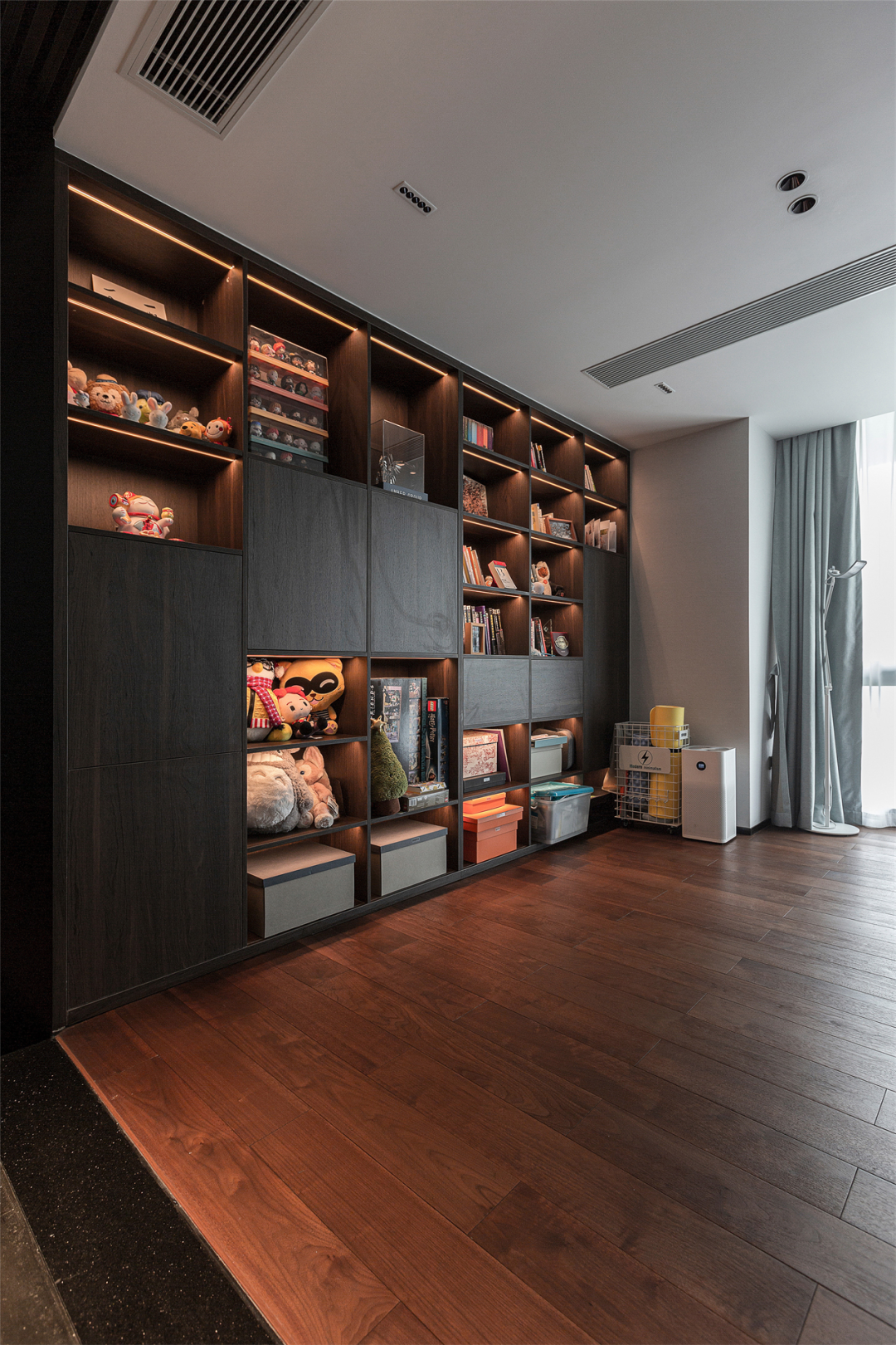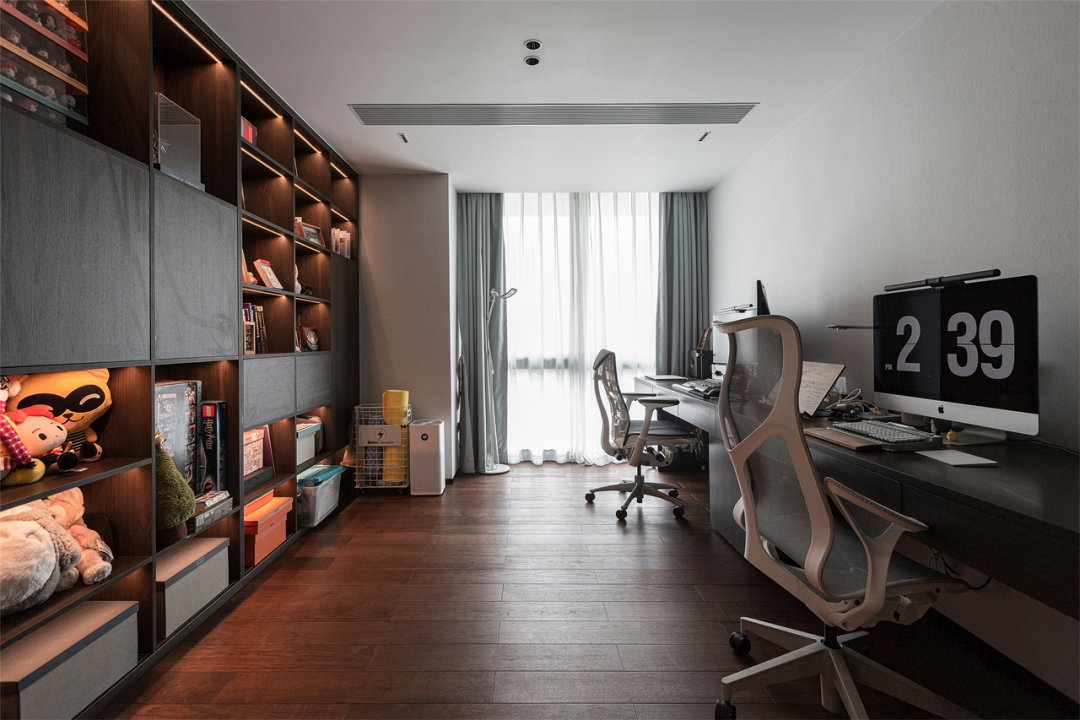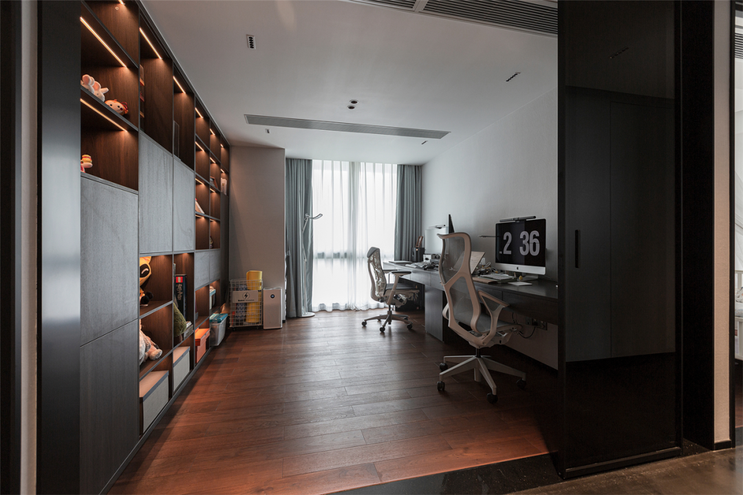 整面收纳柜与墙面融为一体,不同尺寸大小、不同收纳方式,上嵌入灯条,下置入收纳箱,实用性与美学的结合渗透到整个书房之中;另一侧延用柜体同款棕色橡木打造书桌,一字型排布,节省空间的同时让书房更有延伸感,工位美学融入家中。