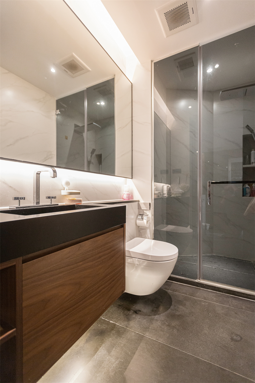 镜柜设置增加储物场所,出水龙头暗装入墙节约台面空间,台盆悬浮设计避免空间堆积和拥堵,用一个又一个的小设计带来大改变!
