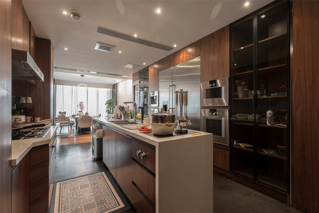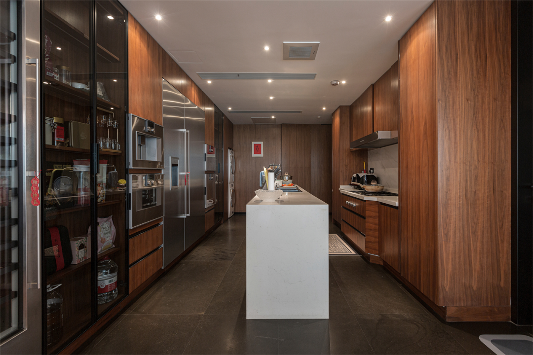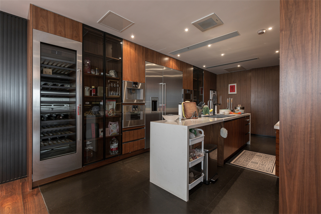 胡桃木与不锈钢交错搭建专业式厨房,独立岛台中置,扩展厨房刚需功能;两侧电器内嵌,超大双开门冰柜、多个烤箱与独立发酵箱,充分满足西厨需求!中间选择玻璃充当储物柜门,跳跃相隔,通透又保留些许隐私,减轻大面积柜体的沉闷感。