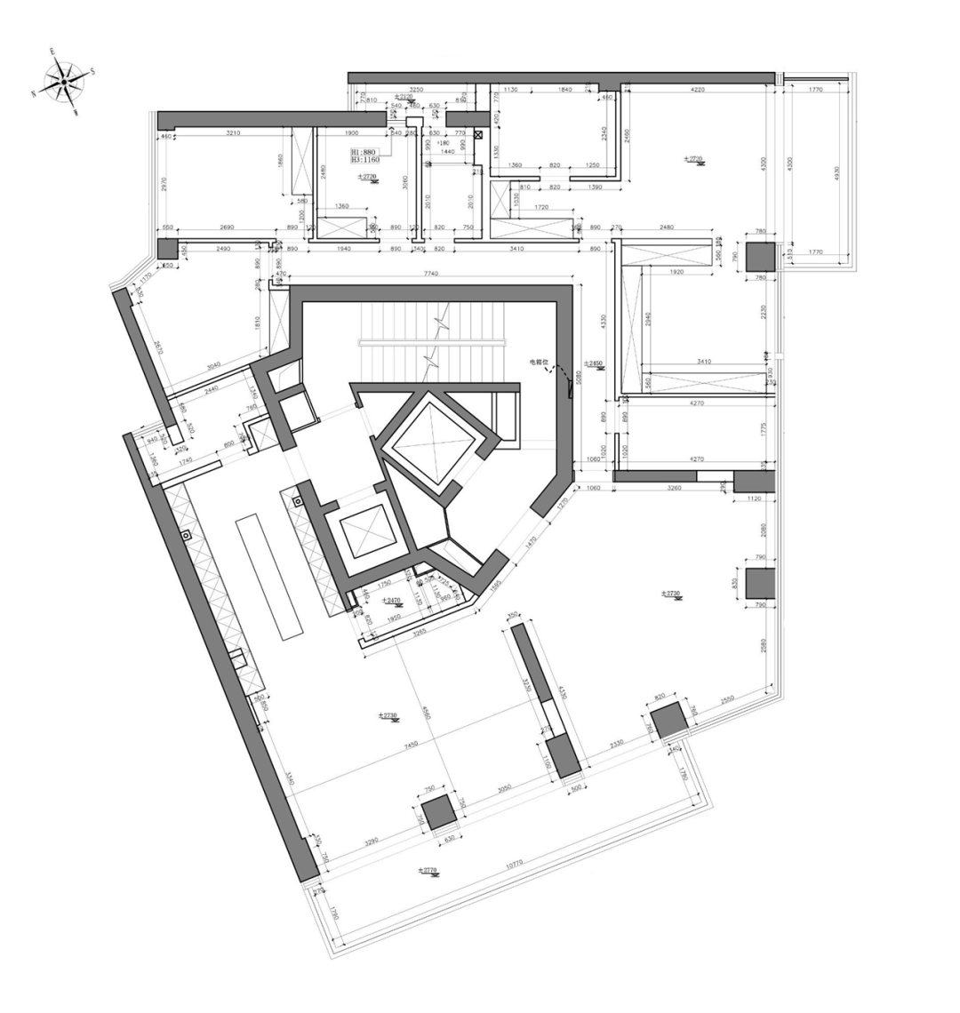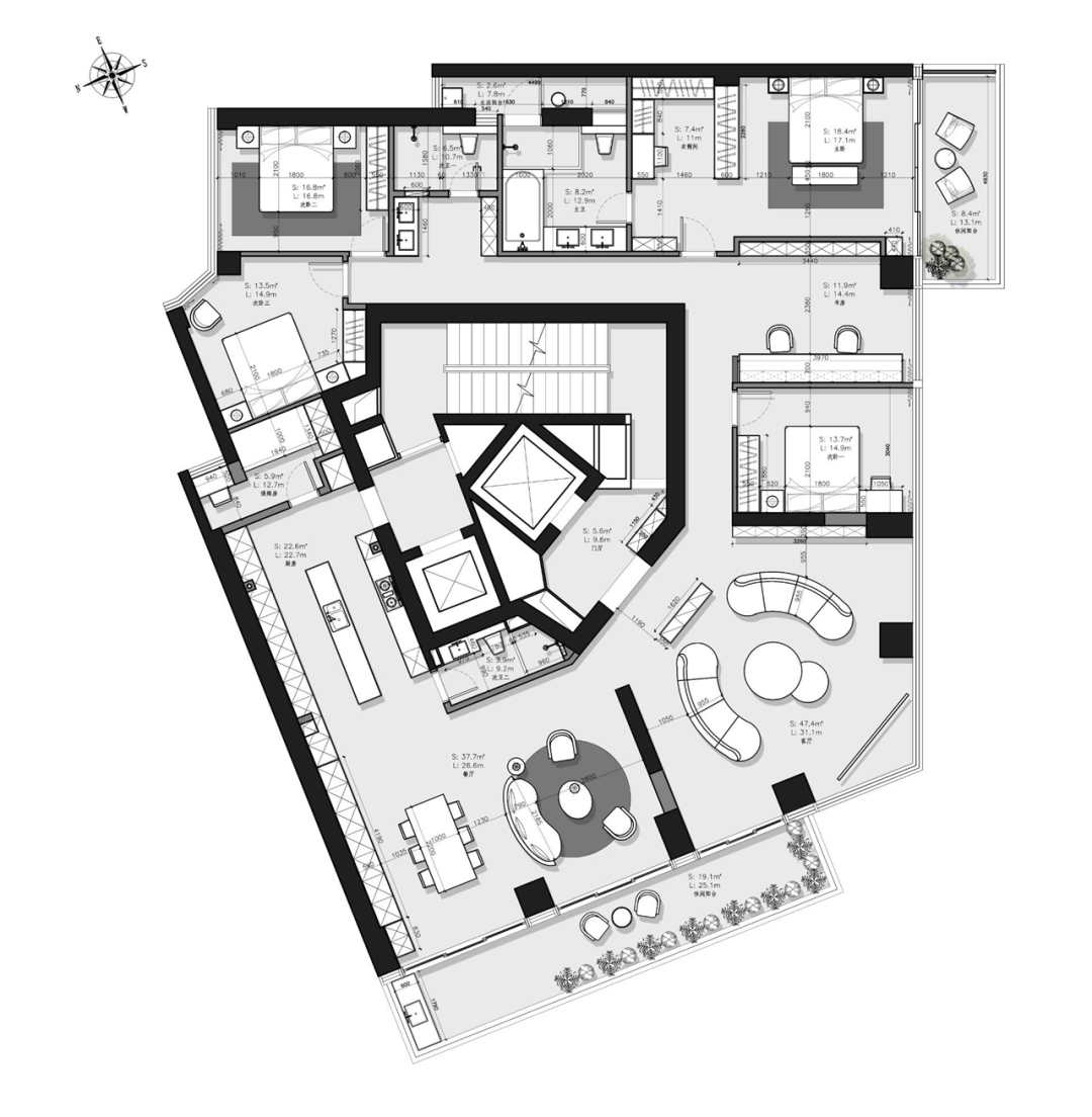 2. 针对静区空间进行重新布局,去掉无用客房,调整多个卧室尺寸比例,改善走廊问题和空间的不适用。