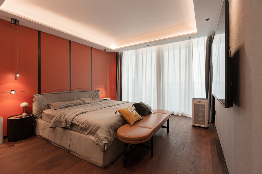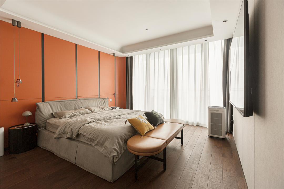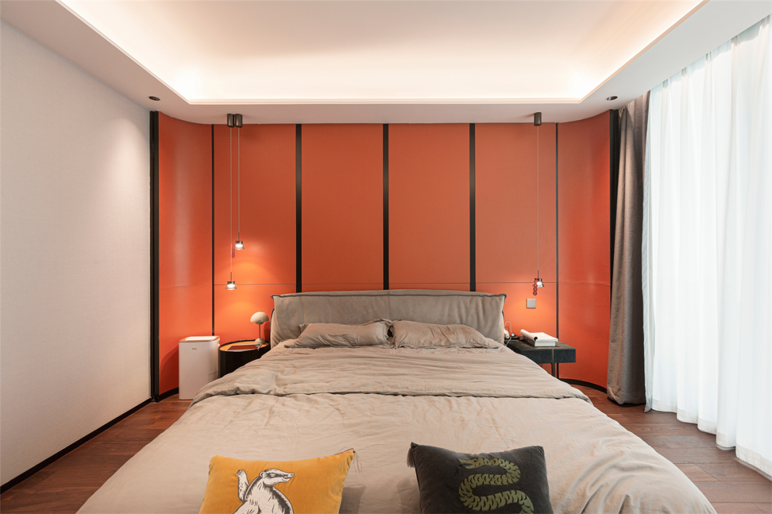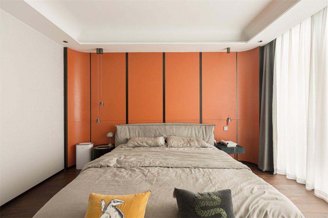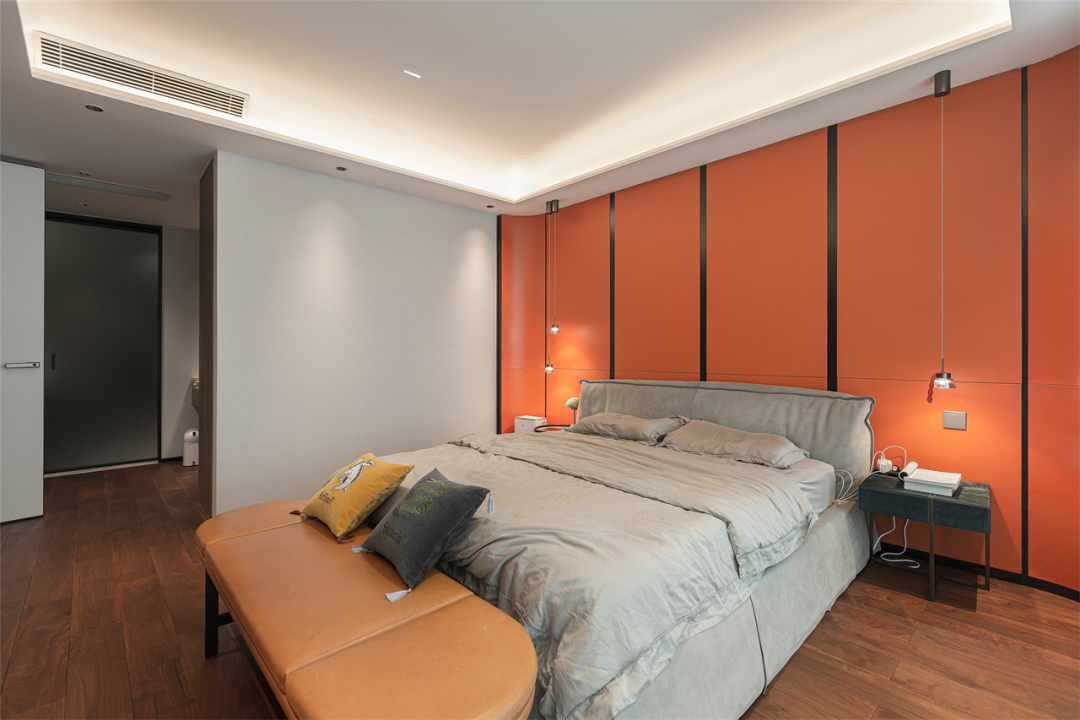 走进主卧,入目就是一片爱马仕橙的天地,热情的能量,活泼的动感,在黑色金属线条的辅助下,耀眼又不令人反感,高贵又不显俗套,将主人家的品质格调提升到极致。