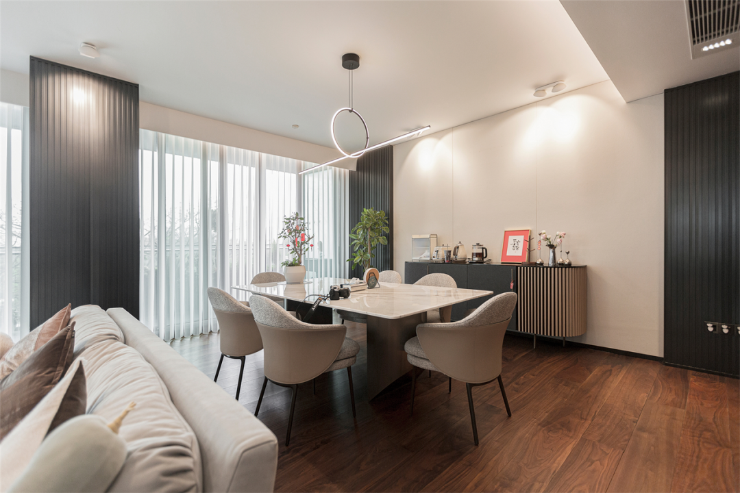直线附着于圆上,两种几何单元合成独特的枝形吊灯,照亮用餐空间;视觉随直线延伸的走向进行下移,选择了规整的长方形岩板餐桌,匹配6张棉麻与皮面结合的餐椅,简约的意式元素汇集,营造利落干净的空间观感。