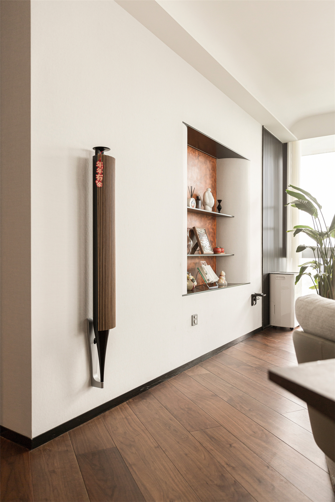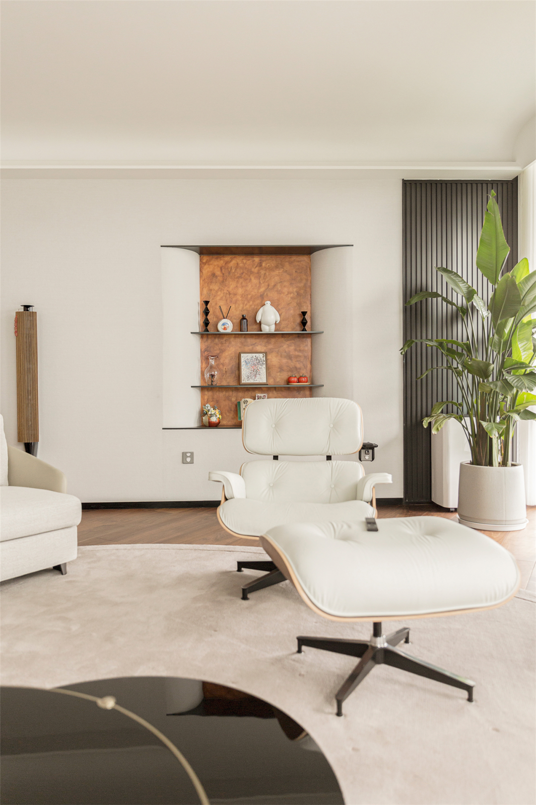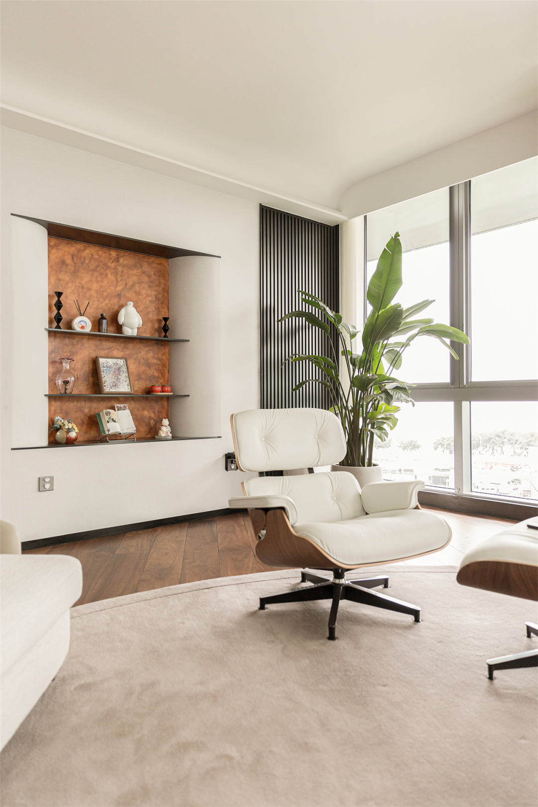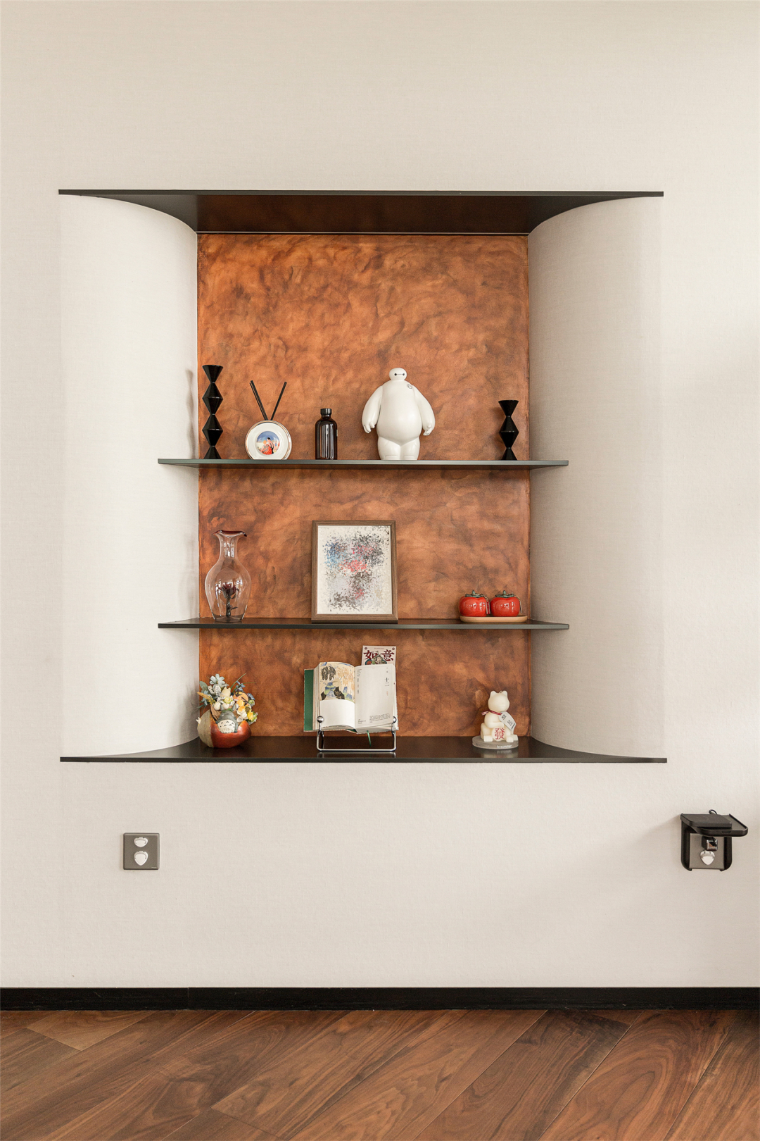 墙面如牛奶般丝滑陷入凹区,不锈钢嵌入墙体,用艺术漆做出材质的对比,摆上几个小摆件,恰到好处的阴阳墙角倒弧,点与线,线与面,形成构图的平衡,为墙面注入一丝温柔,为空间注入一抹活力。