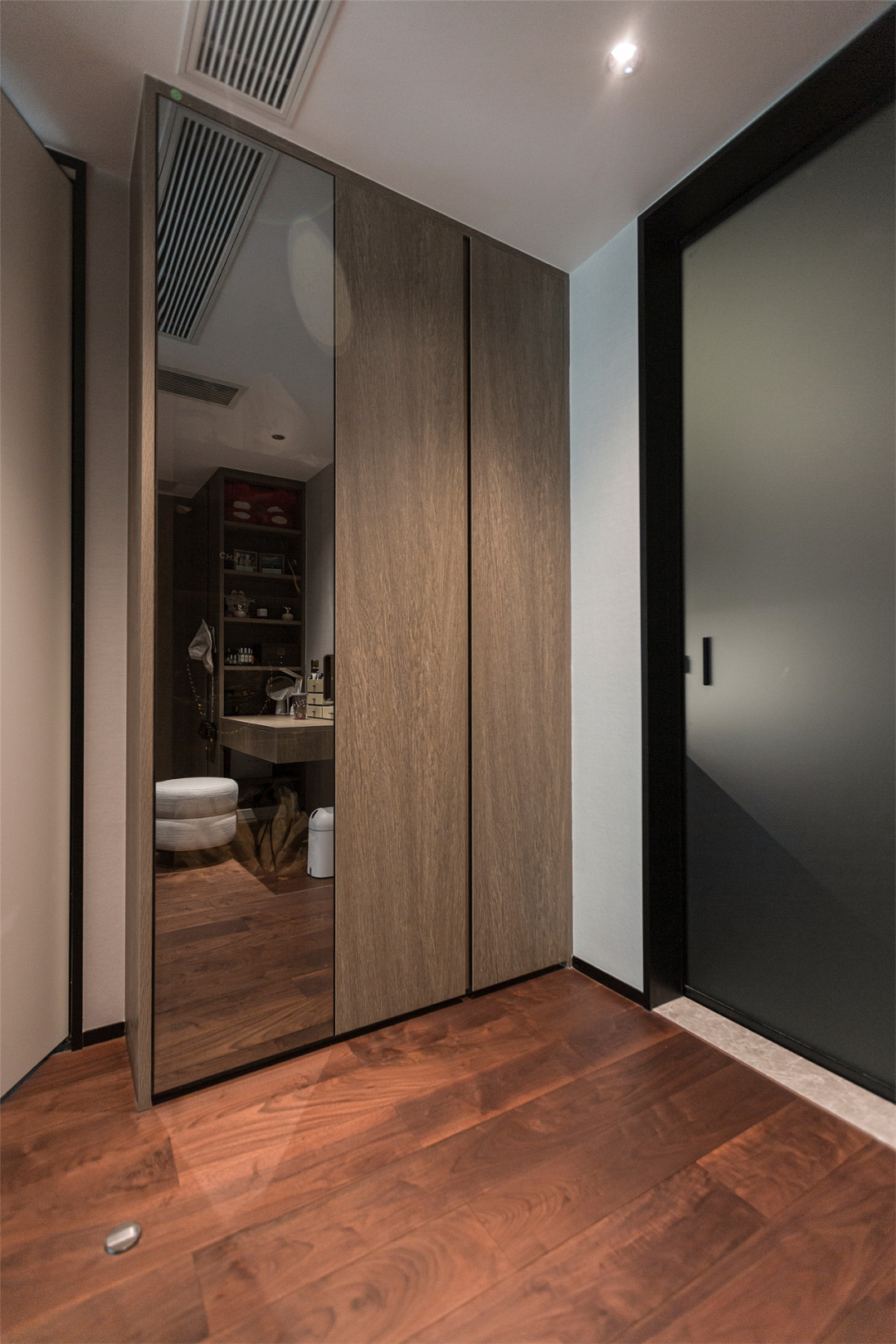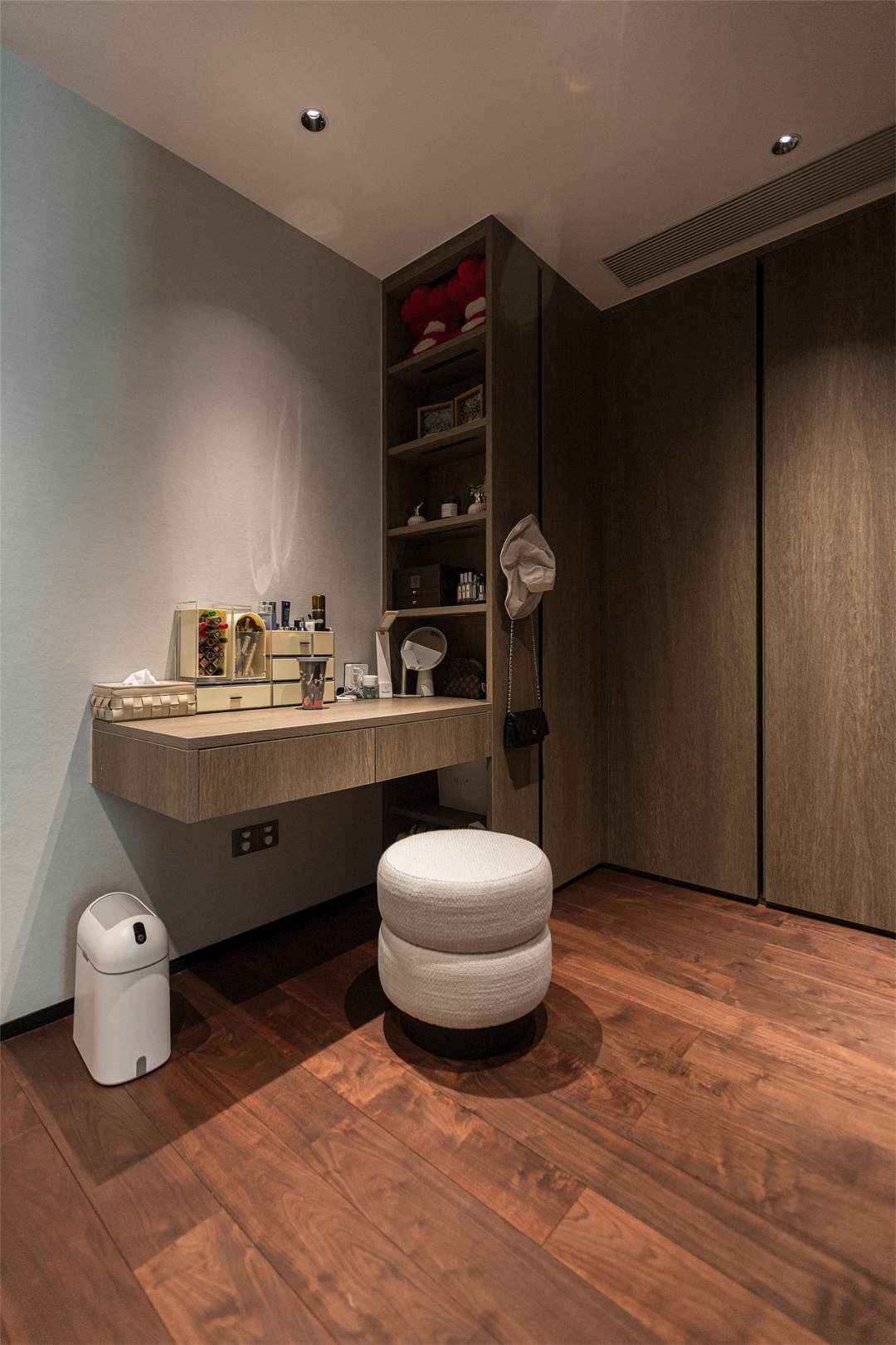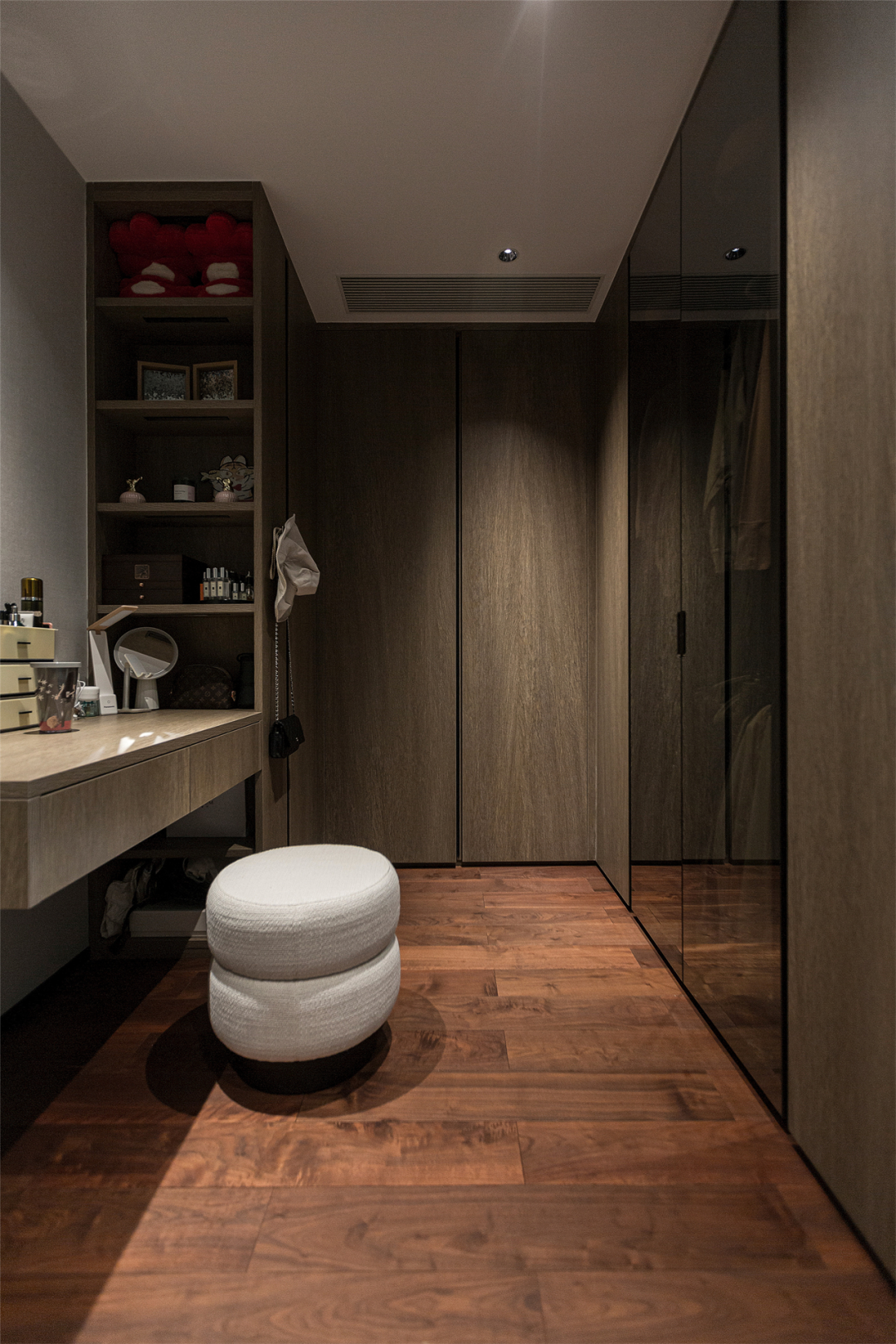衣橱顶替死板的墙面,开放式布局使空间开阔不少;梳妆桌与衣柜U型连体设计,简洁的线条与统一的材质,在玻璃的衬托下,自带稳重高级感。