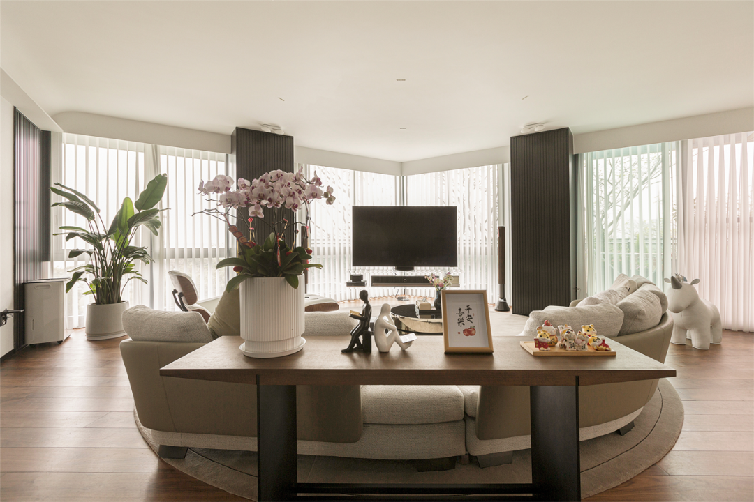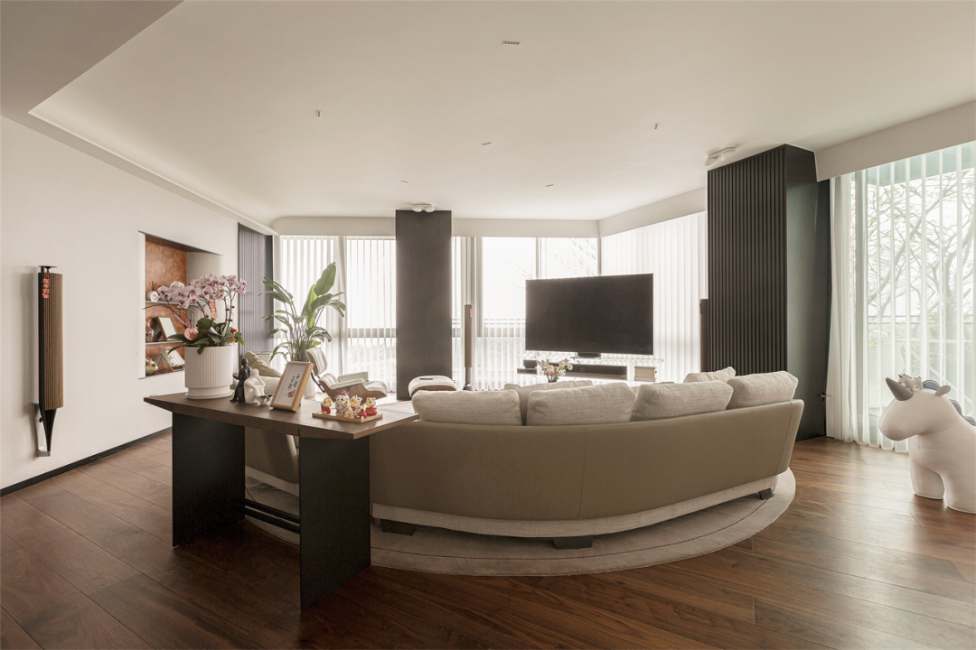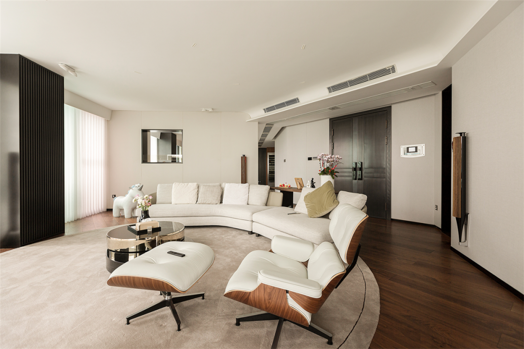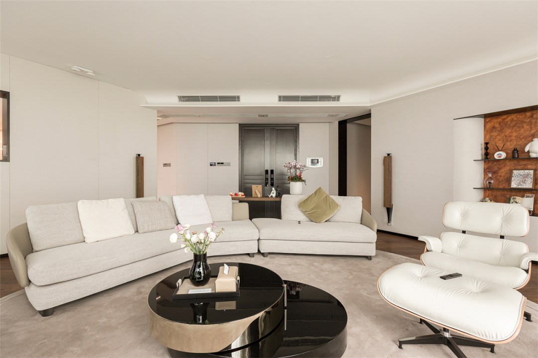 屋内整体调性选择了视觉柔和的简约色调,在呈夹角之势延展的落地窗前,匹配大面积的白来增强会客厅整体明亮感,推门而入,迎面的明朗拼凑雀跃的情感传递。