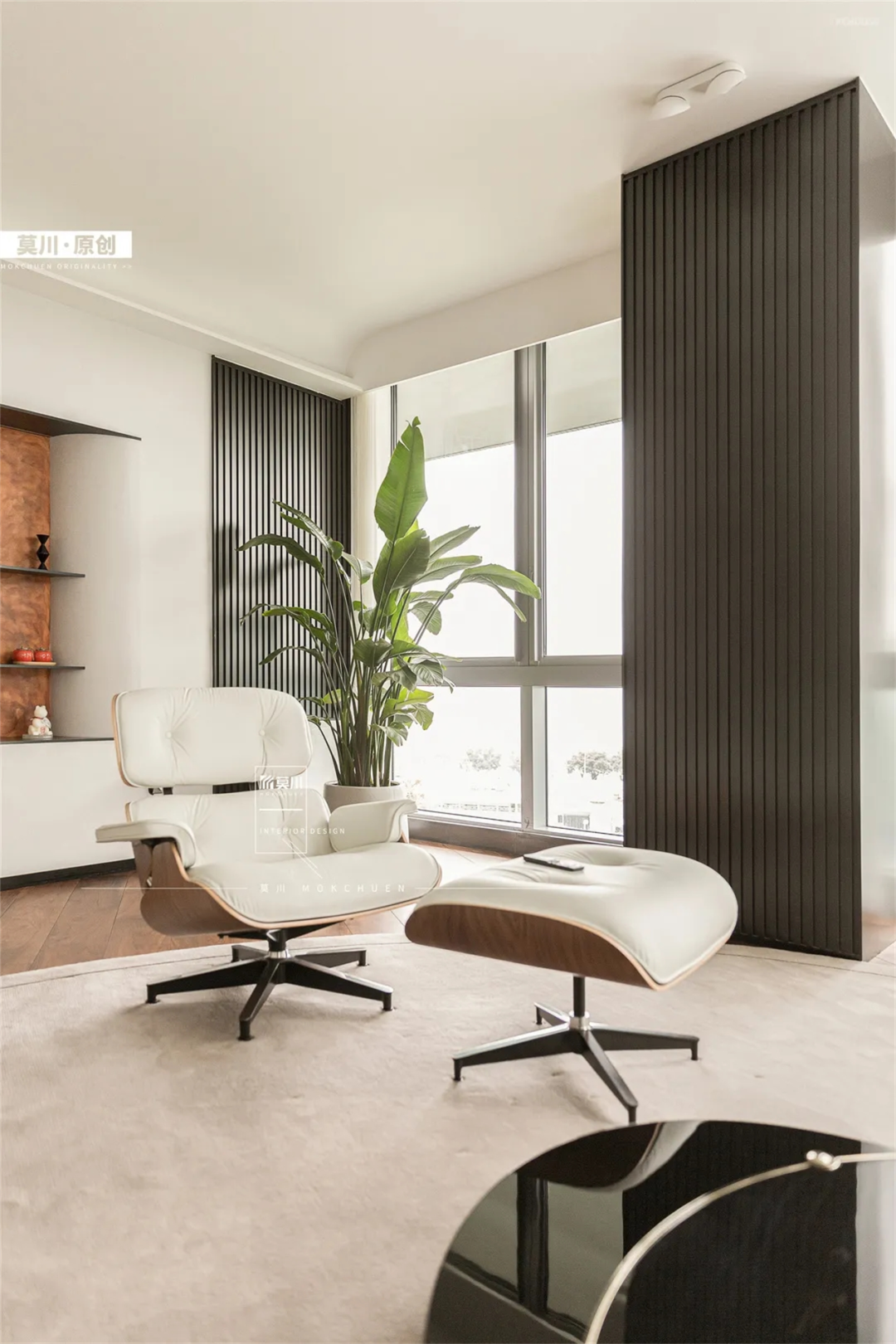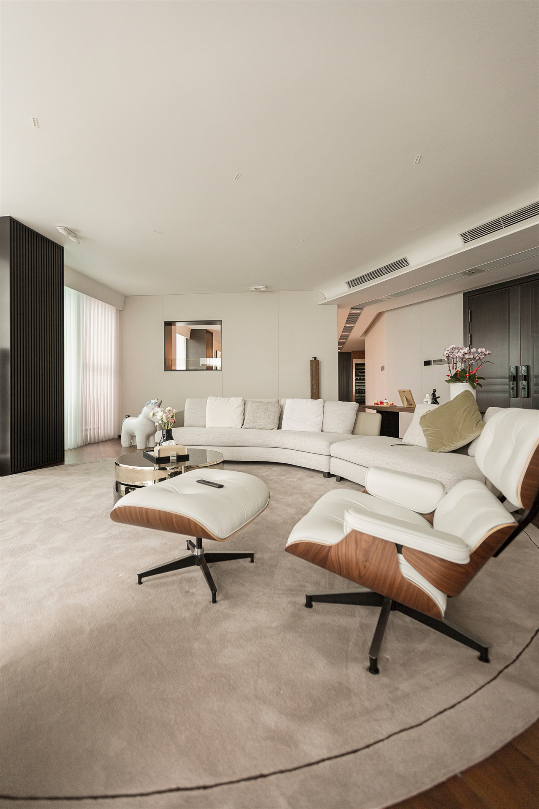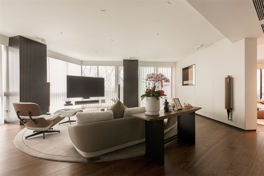 屋内整体调性选择了视觉柔和的简约色调,在呈夹角之势延展的落地窗前,匹配大面积的白来增强会客厅整体明亮感,推门而入,迎面的明朗拼凑雀跃的情感传递。