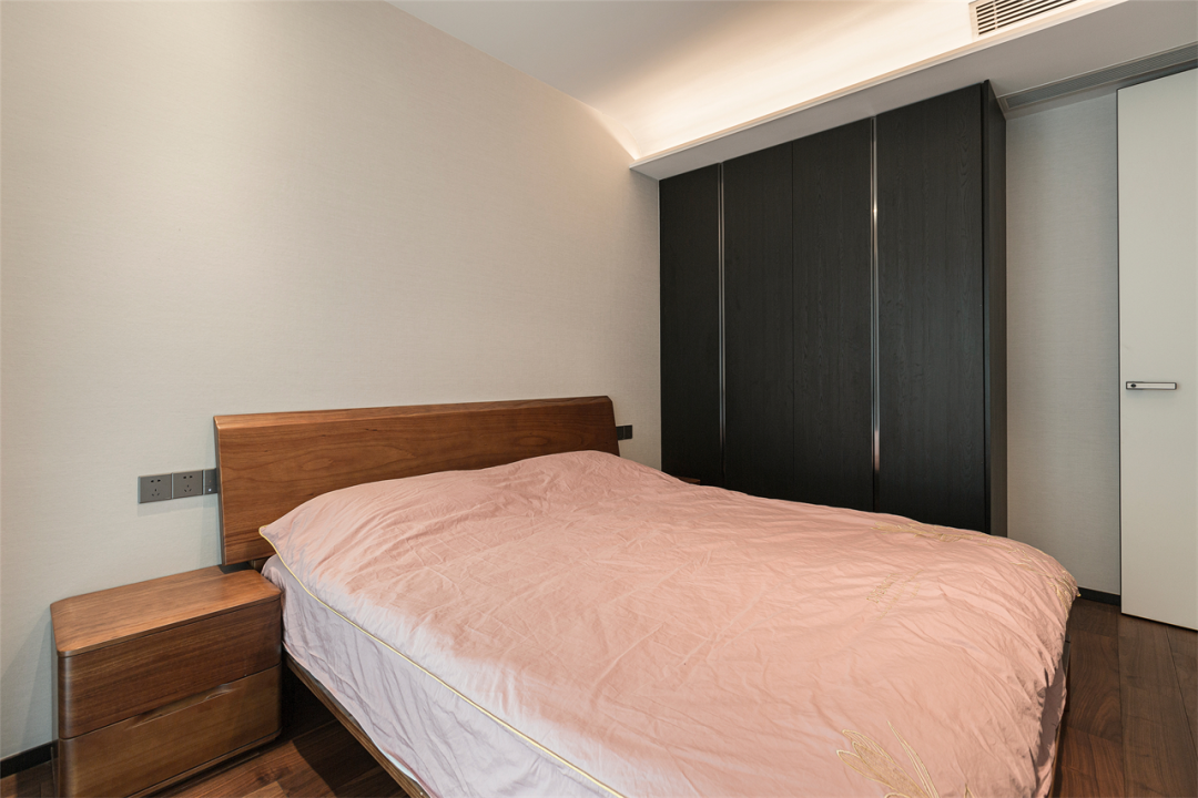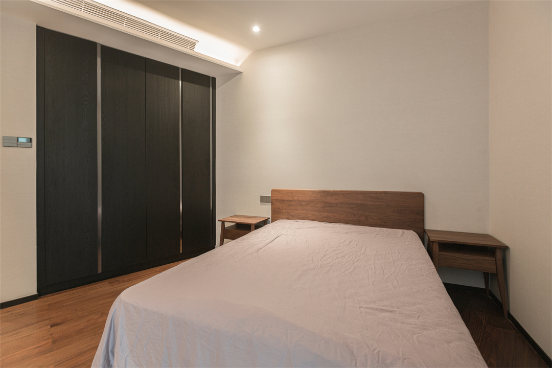 利用墙面嵌入衣柜,子母隐藏拉手,一通到顶的银色元素,显得简约大气,于细微处增加设计感。另一面墙不做过多装饰,简单刷漆,樱桃木占据床头,不固定边几为空间提供更多可能。