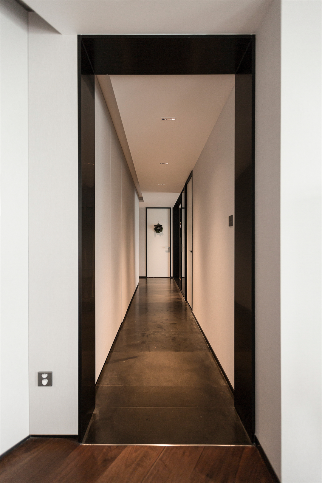 黑色门套开启走廊空间,主卧门相对而立,白色门板与黑色边框,点缀装饰物自成一景。