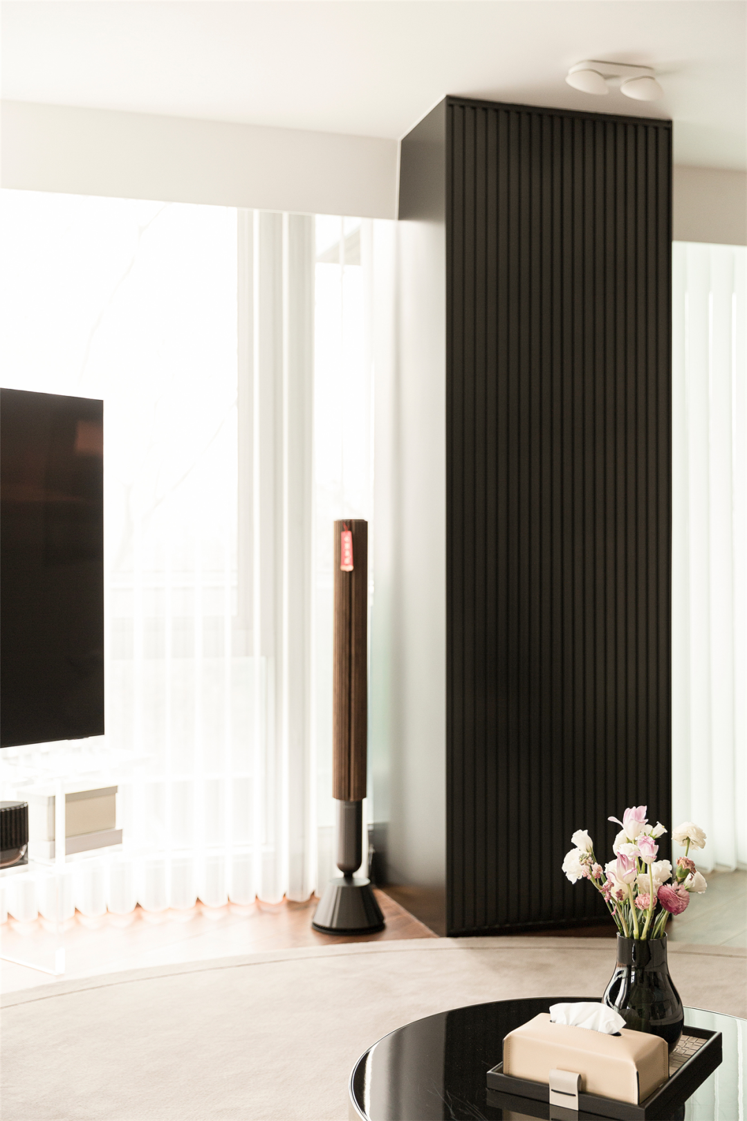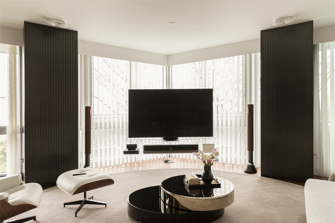 电视落座夹角之间,放在亚克力定制的柜架上,既有漂浮感又不阻挡落地窗的视线,两侧承重墙用内敛的黑色不锈钢格栅收入其中,伫立在旁仿佛两名士兵守卫着空间,经典白与黑在梦幻帘下和谐又自然。